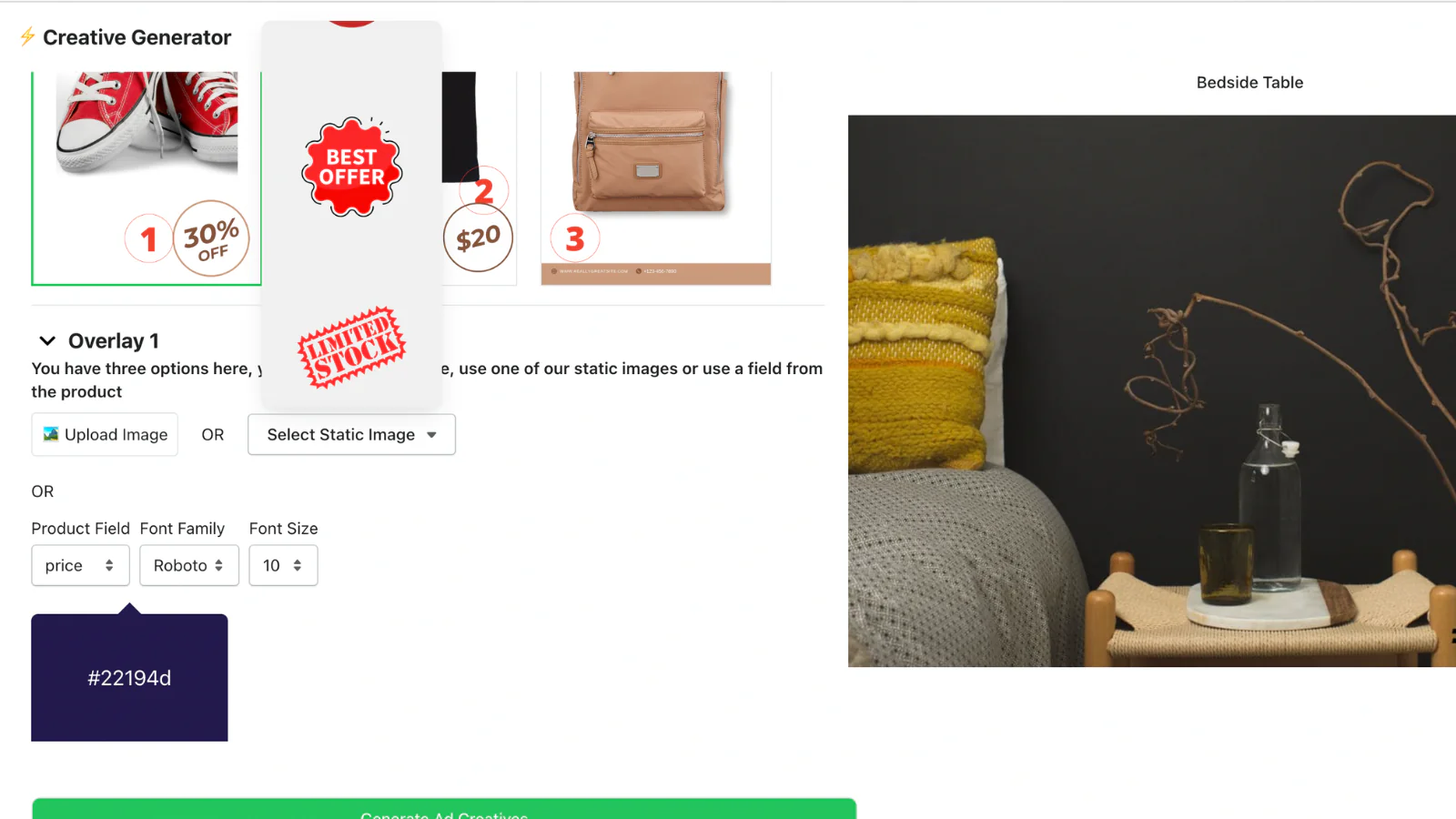 If all of that isn't enough we also allow dynamic fields to be placed on your product images, which means you can display the price (or other field) of the product on the product image. This gives you the ability to create a bulk of ad creatives with the price of that product overlaid on each image. This not only saves you time but also helps your customer identify the price of the product right away which is great when doing carousel ads!
