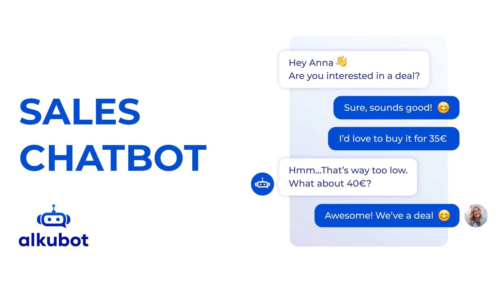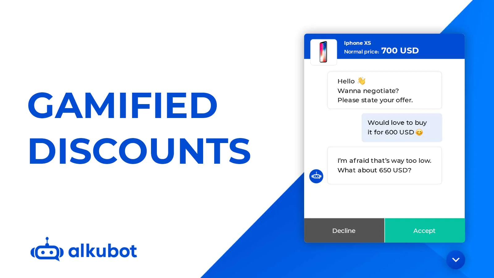 Imagine that a potential buyer is browsing your store. But somehow he is not committed to buying so he is thinking about leaving your store. That is when Alkubot comes to save the day, by starting a negotiation chat with the visitor and playfully selling your products by giving a discount.