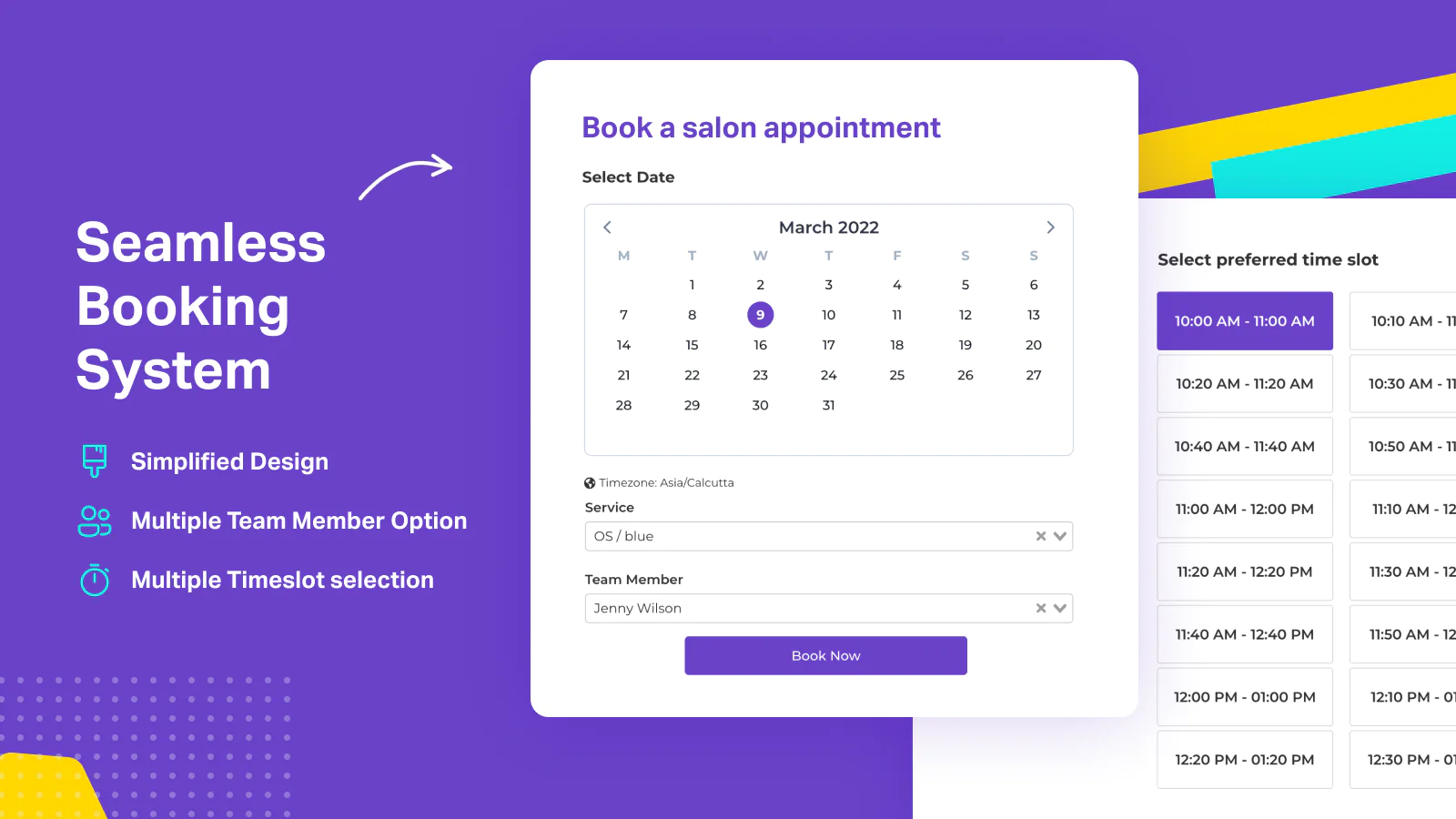 Add team members, and manage their individual calendars and availability. Assign team members to service. Allows customers to select team members during booking the appointment.