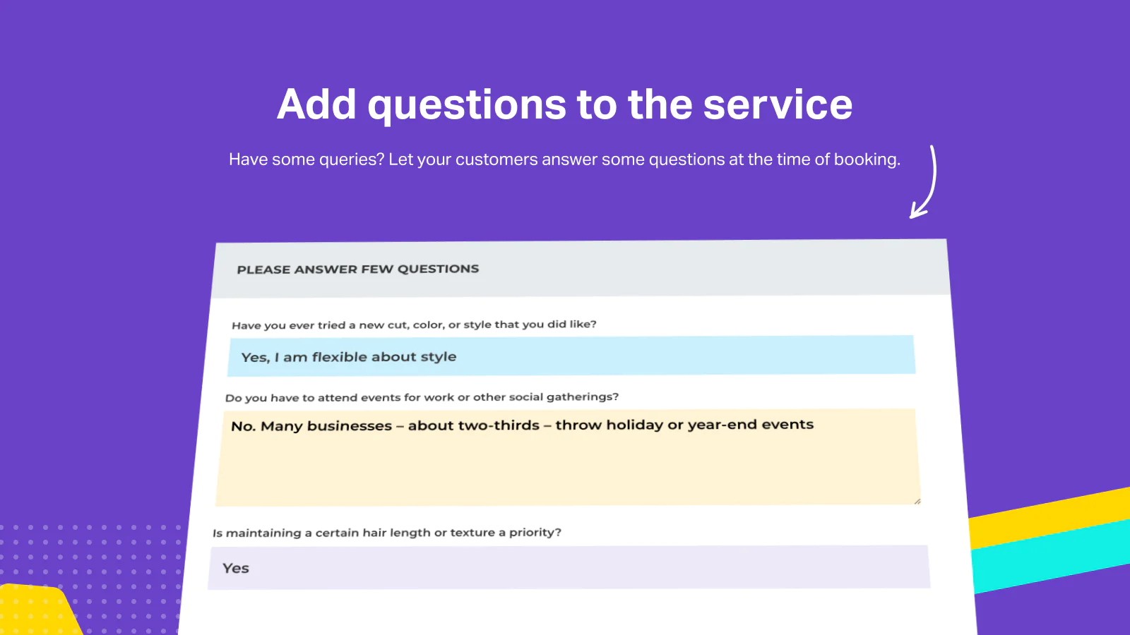 Ask questions from customers directly from the booking widget. Helpful in cases where you need some information from clients prior to attending appointments.