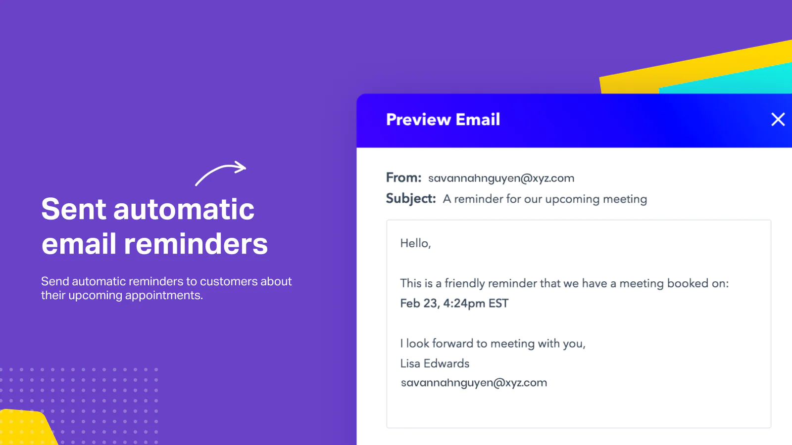 Email/Text Notifications : Automatic email notifications. Keep customers updated for their appointments with automatic email reminders and calendar invites.