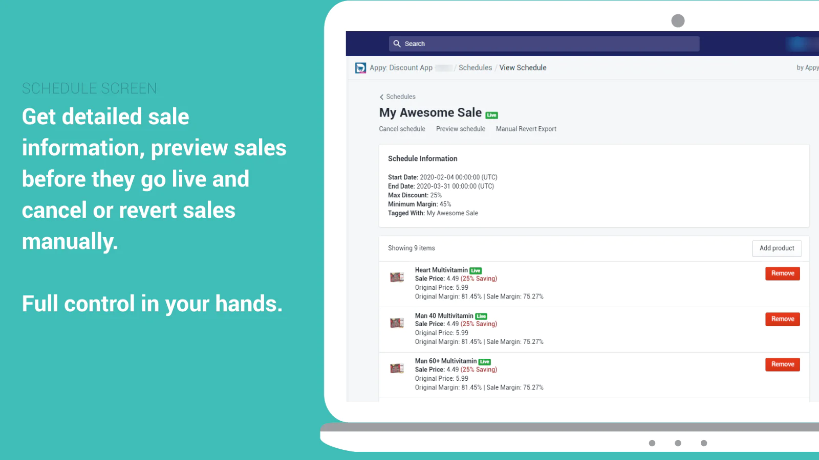 Schedule sales and product discounts and let us take the hassle away and do the work for you. No more waiting up at midnight to manually change prices again over the big sales days such as Black Friday, Cyber Monday, Christmas, and many more.
