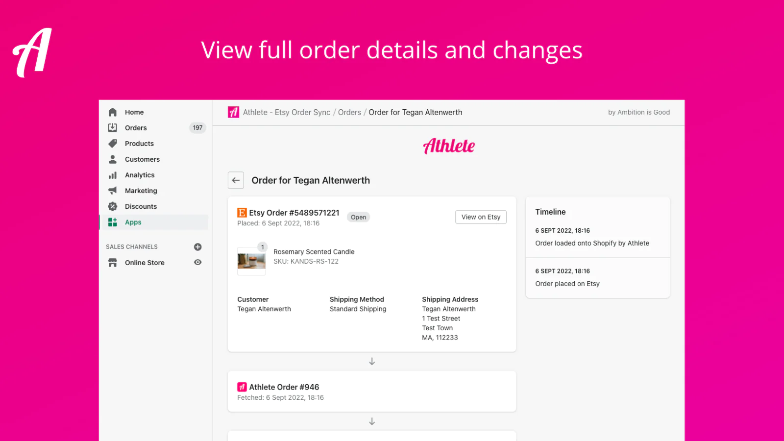 We built Athlete for our own busy stores after trying the alternatives and wishing for more. We wanted an app that synced orders really quickly, was fault tolerant (Etsy has downtime!), had a slick interface that worked within the Shopify admin and mobile app and handled complex cases such as upgraded shipping, discounts and personalisation. It didn’t exist, so we built it!