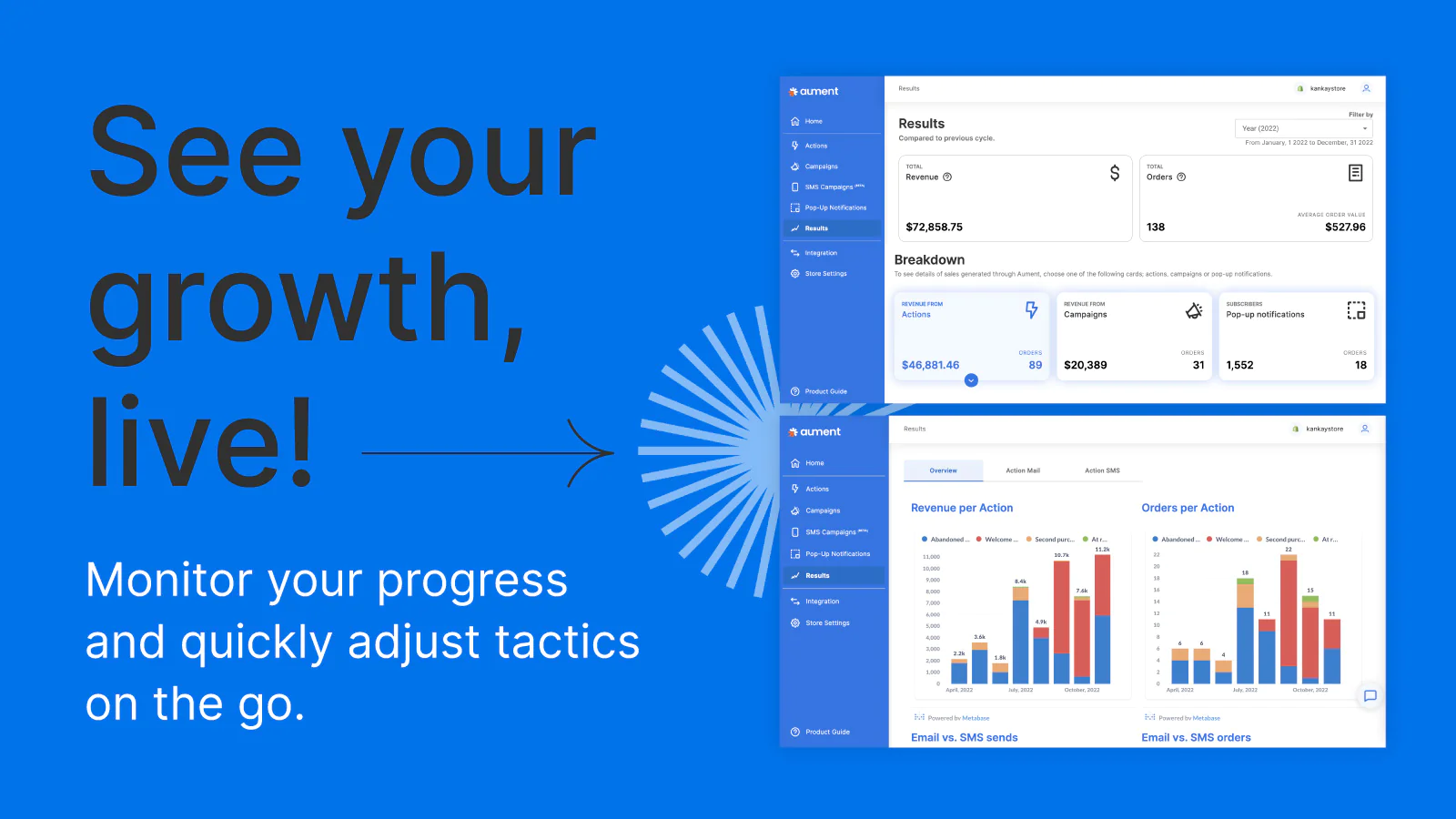 Increase sales — boost revenue : Incentivize repeat purchases, recover abandoned carts through email and SMS, and increase visitor conversion with pop-up notifications.
