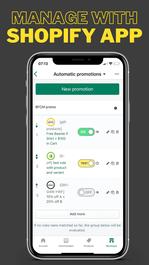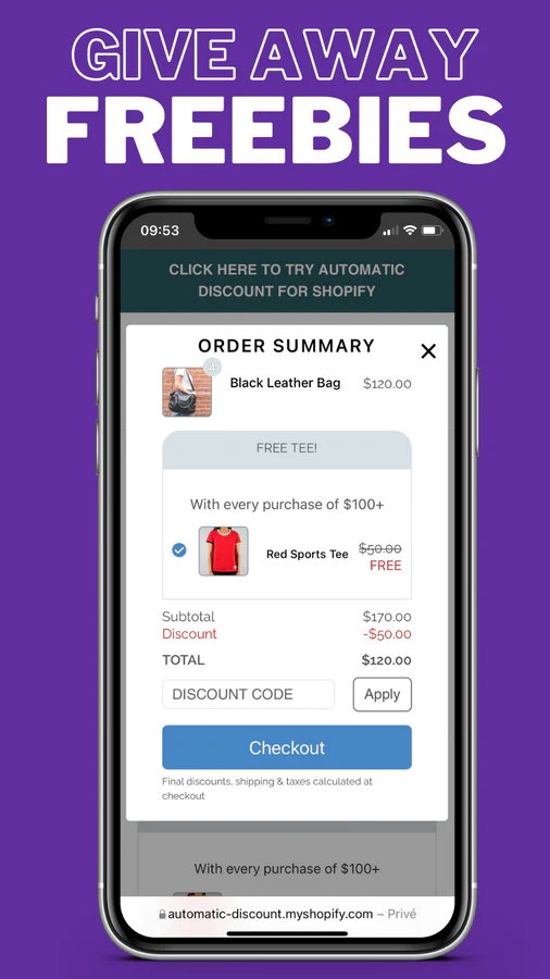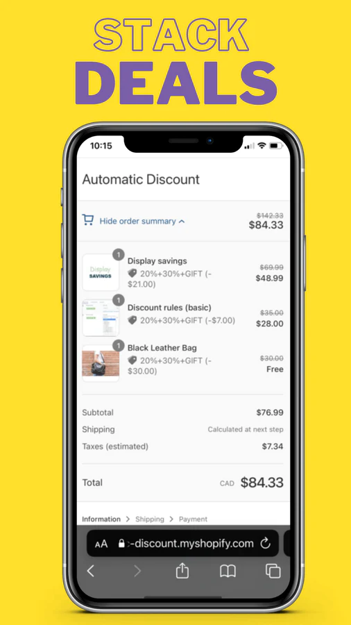 Automatic Custom Deals : Build custom deals, more flexible than Shopify discounts: % off + gift, buy 2 for $8, 10% up to $100, 5% A + 9% B, cheapest item in cart.