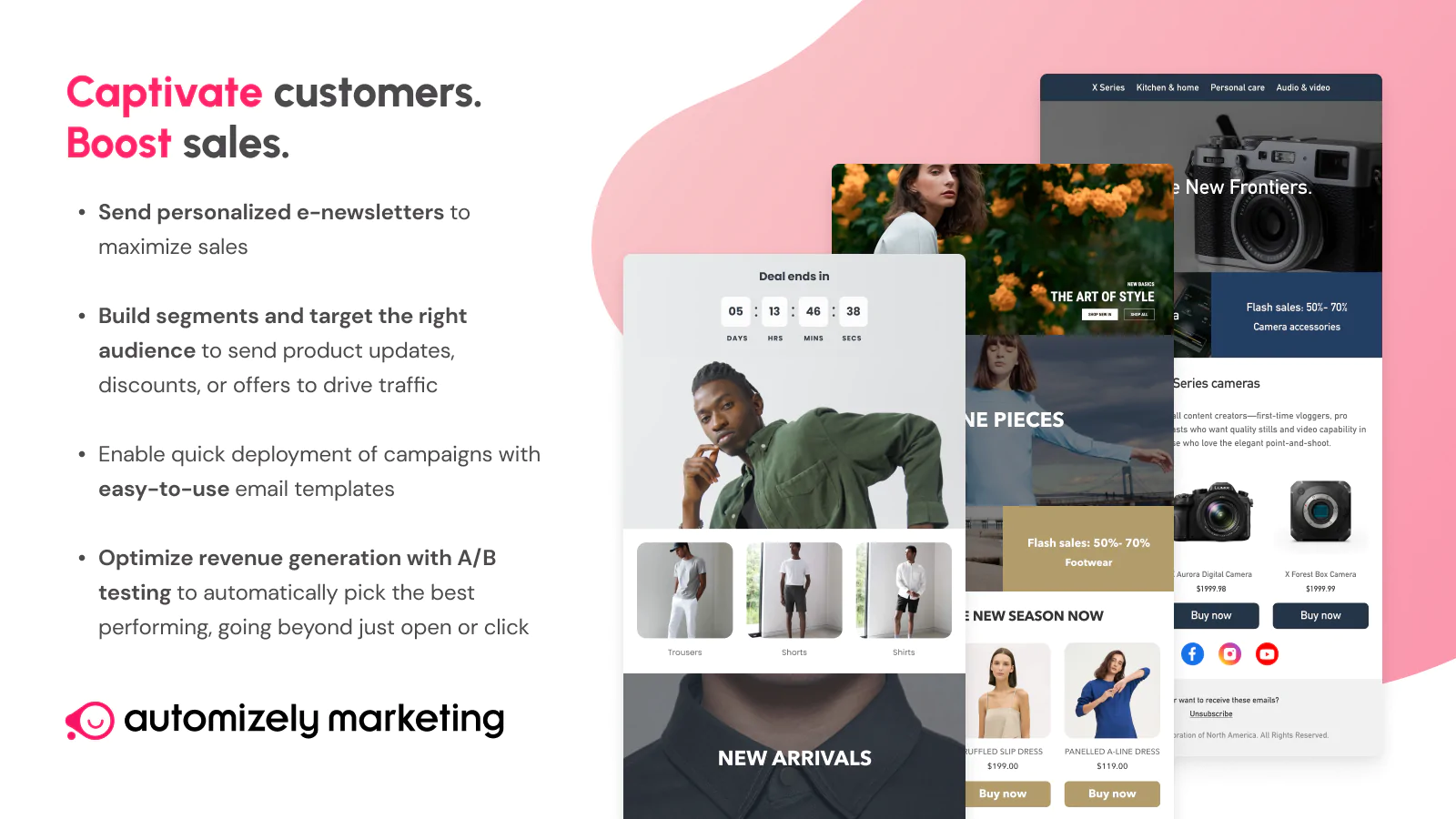 Automizely Marketing is an all-in-one eCommerce marketing automation platform that empowers brands to drive leads, customer engagement, and sales with the help of world-class sales and marketing tools via one intuitive portal. On top of email and SMS marketing, Automizely Marketing serves merchants with other advanced tools like AI-powered product recommendations, countdown timers, and promotional bars to create interactive experiences that are proven to drive sales. What’s more, all these tools are ready to be used with minimal effort and without technical expertise or assistance.