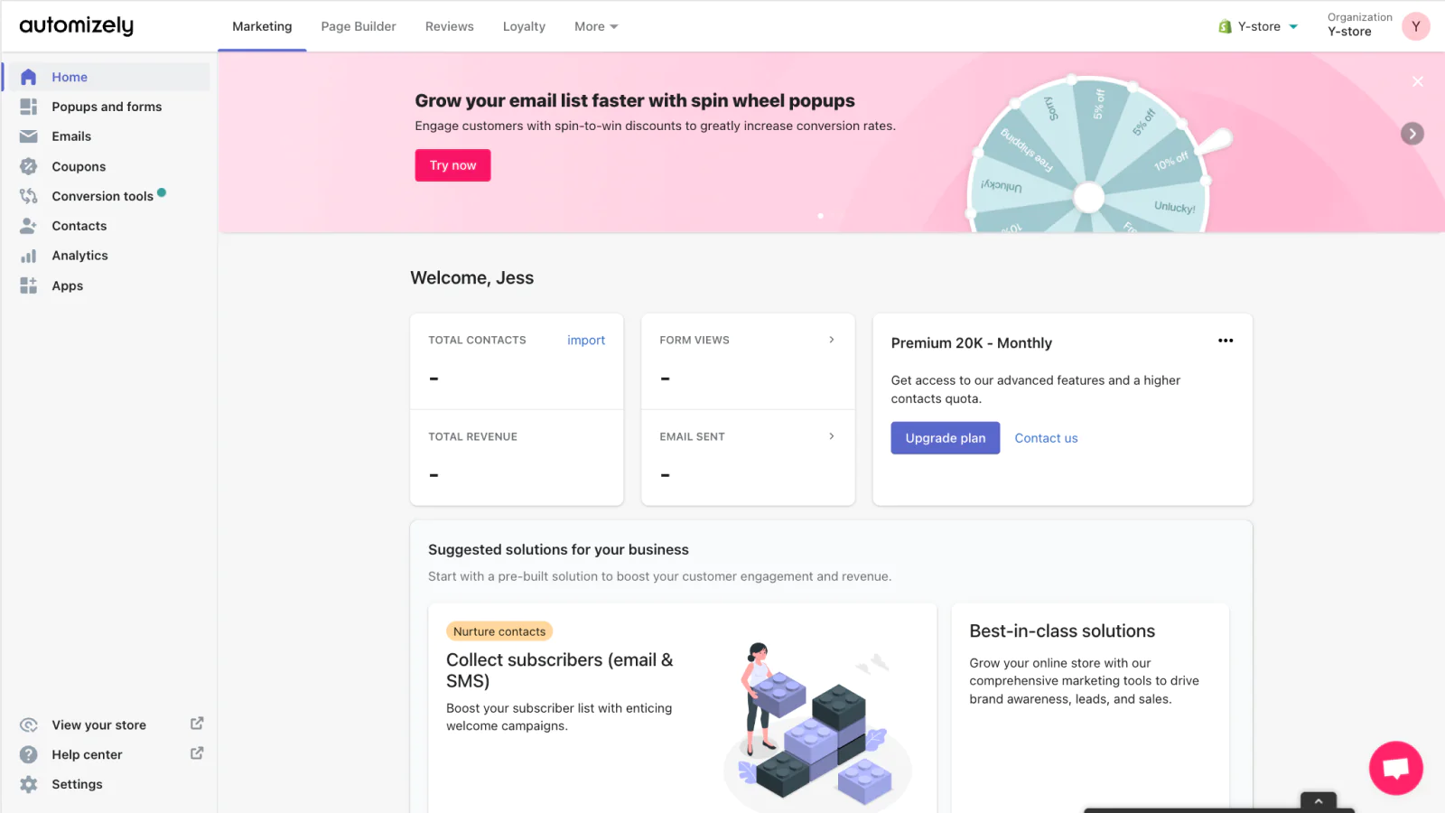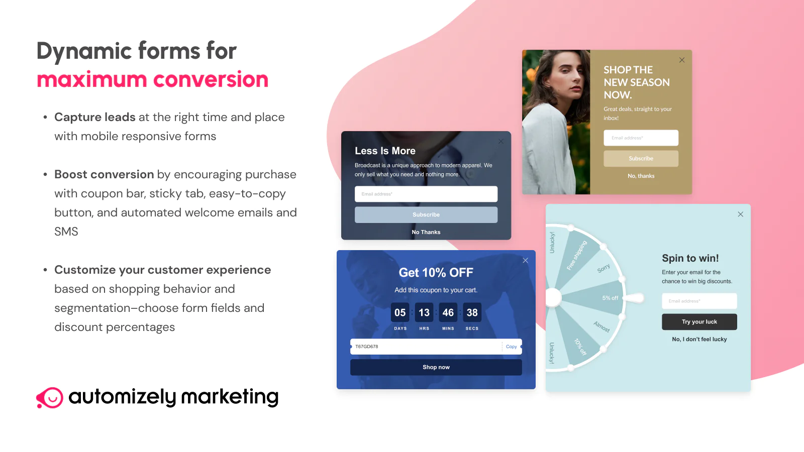 Build and auto-trigger behavior-specific popups and forms, including welcome, exit intent, upsell, spin-wheel, and cart recovery popups. Select a theme from pre-built templates or create your own.