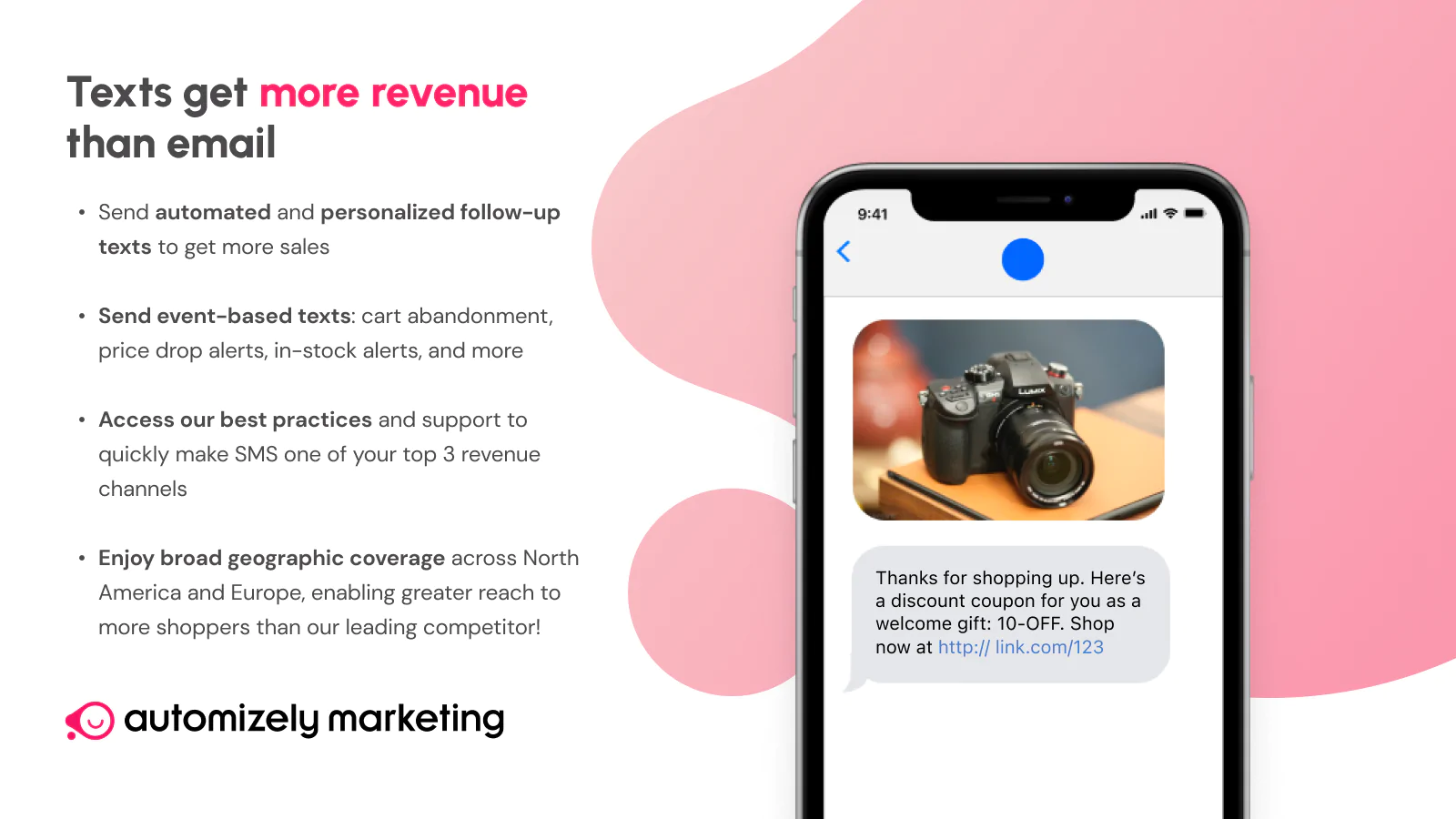 Send automated follow-up texts, notify them about new products and recover abandoned carts through SMS. Enjoy a broader geographic coverage across North America and Europe.