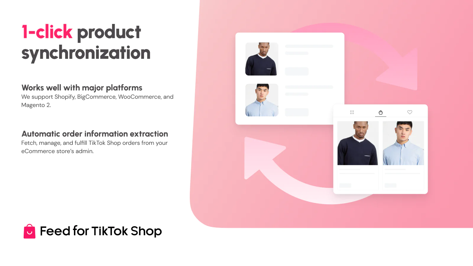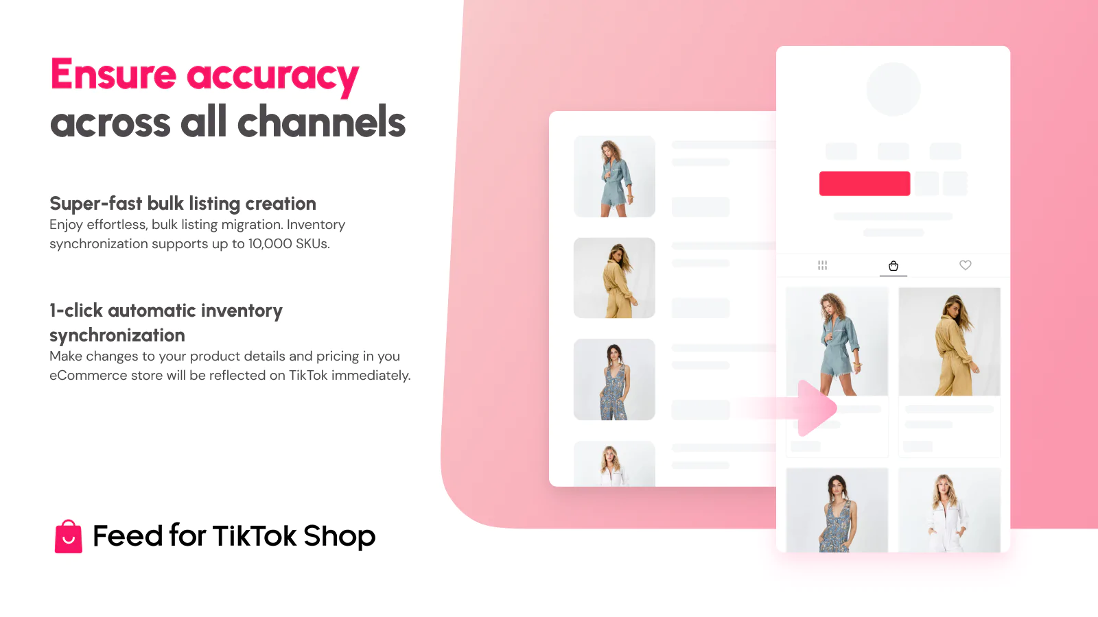 Feed for TikTok Shop works smarter, not harder. Make changes to your product details and pricing in your eCommerce store and see the updates reflected on TikTok Shop immediately.