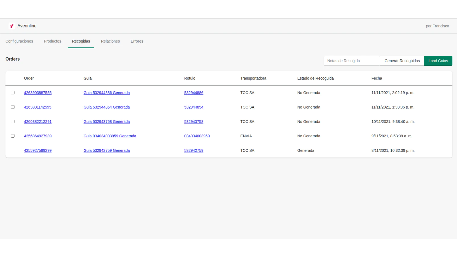 Podrás ver todos los pedidos con envió Aveonline, y generar la recogida de uno o varios pedidos