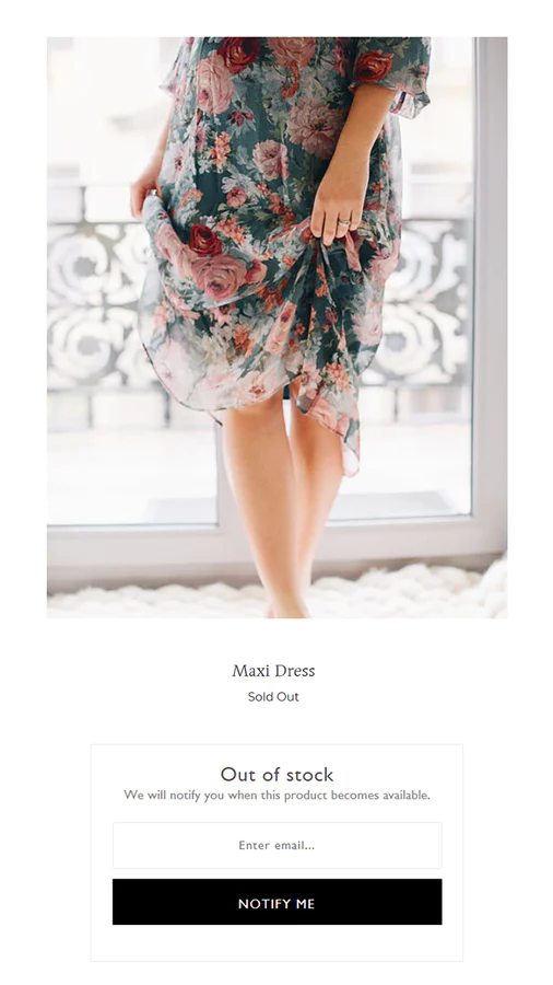 If a customer finds the product they're looking for and it is out of stock, a notification widget will be presented and they can enter in their email so they will be notified once the product is back in stock.