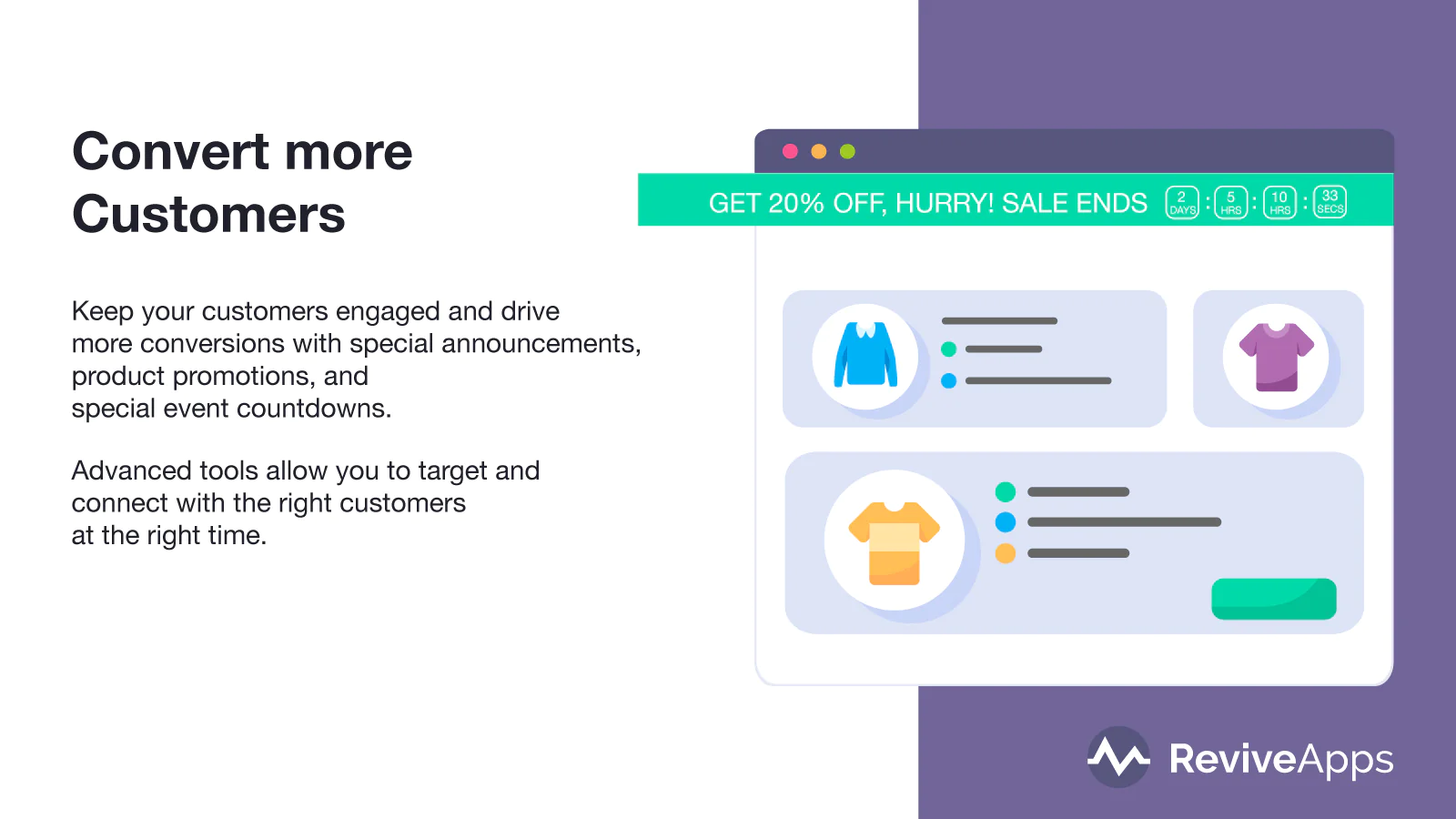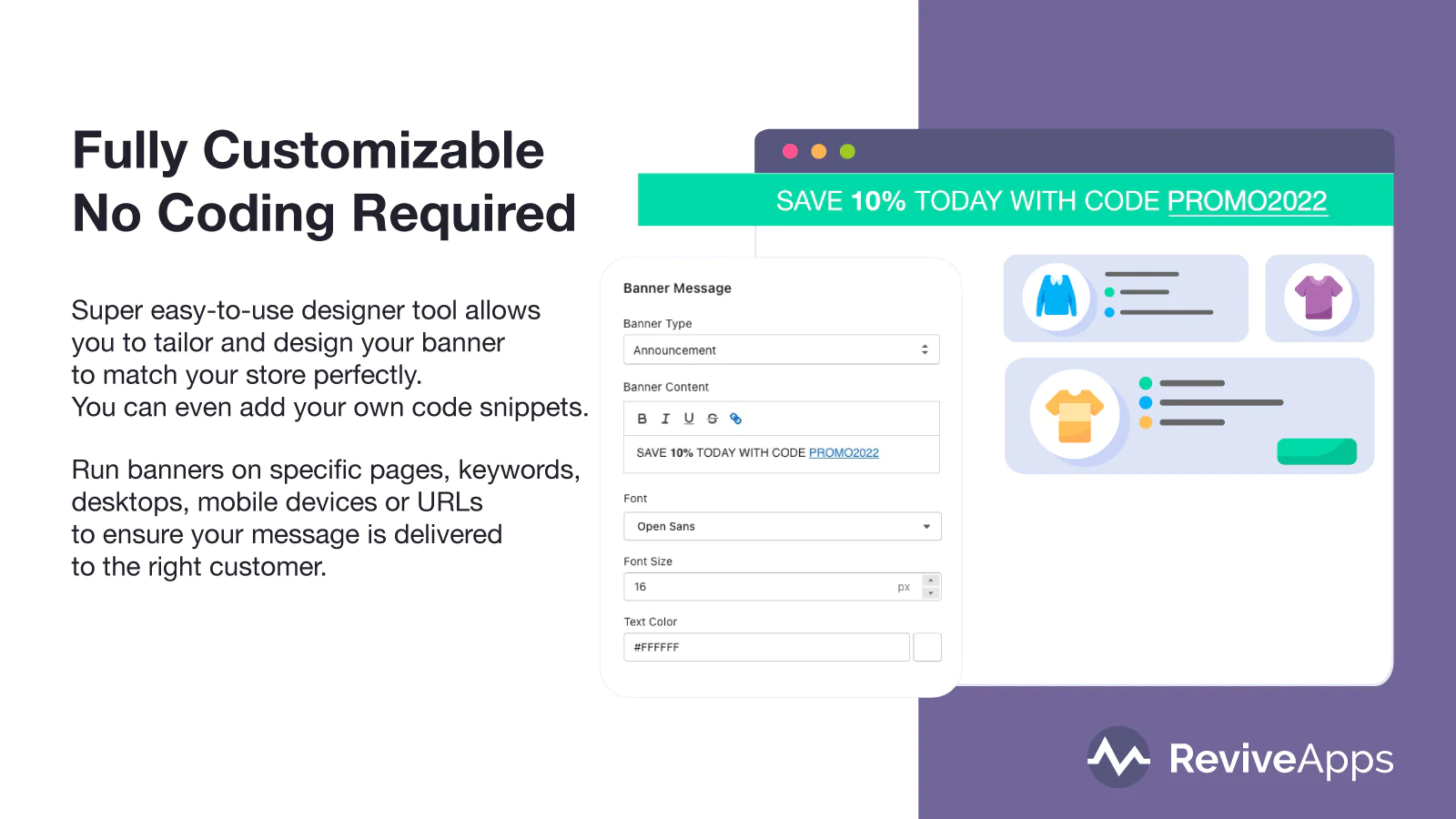 Create a wide variety of banners, including dynamic free shipping messages, countdown timers, and effective announcements that are guaranteed to get attention.