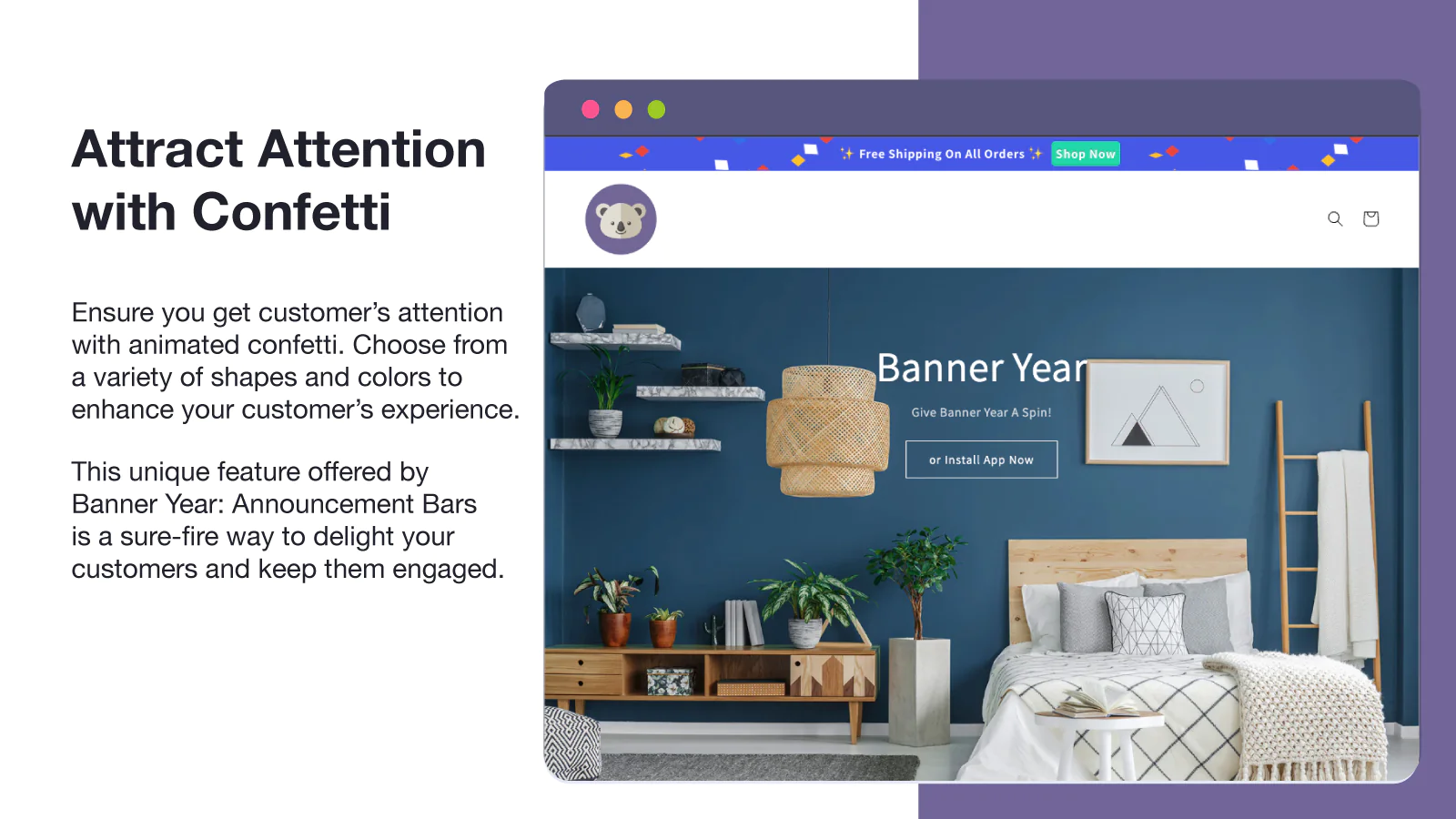 Set up in less than a minute : Adding Banner Year: Announcement Bars to your store is a snap. Click "Add app", choose one from our custom themes, publish, and you’re done!