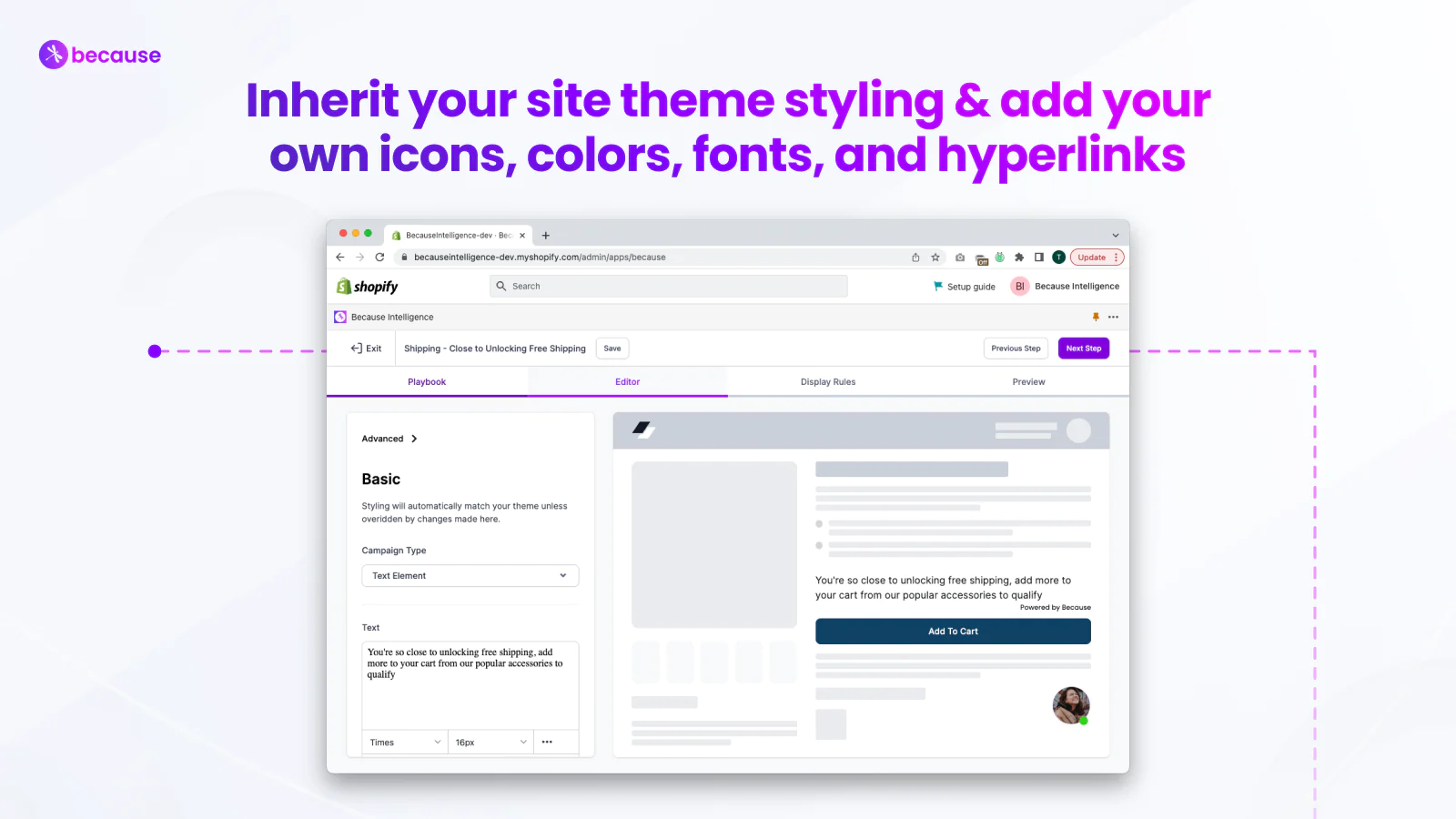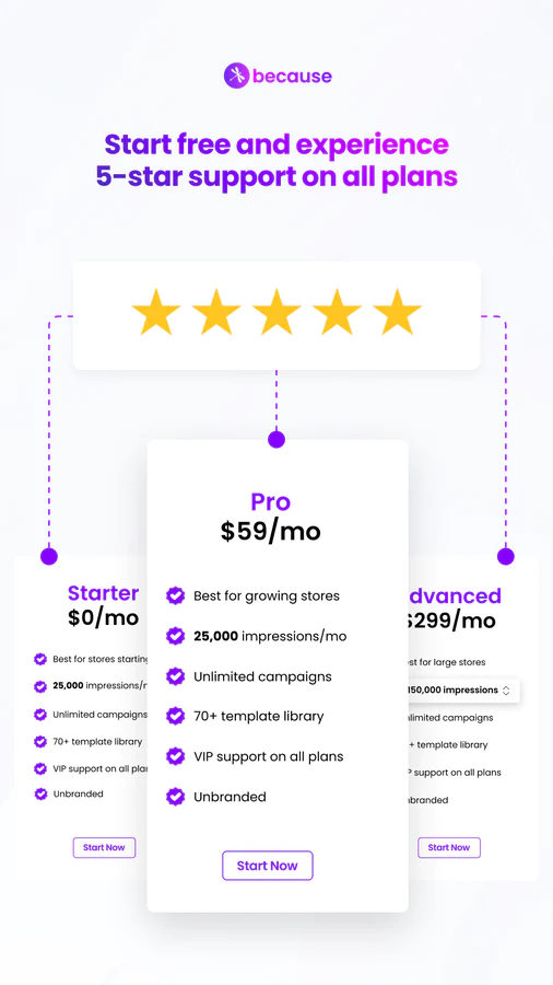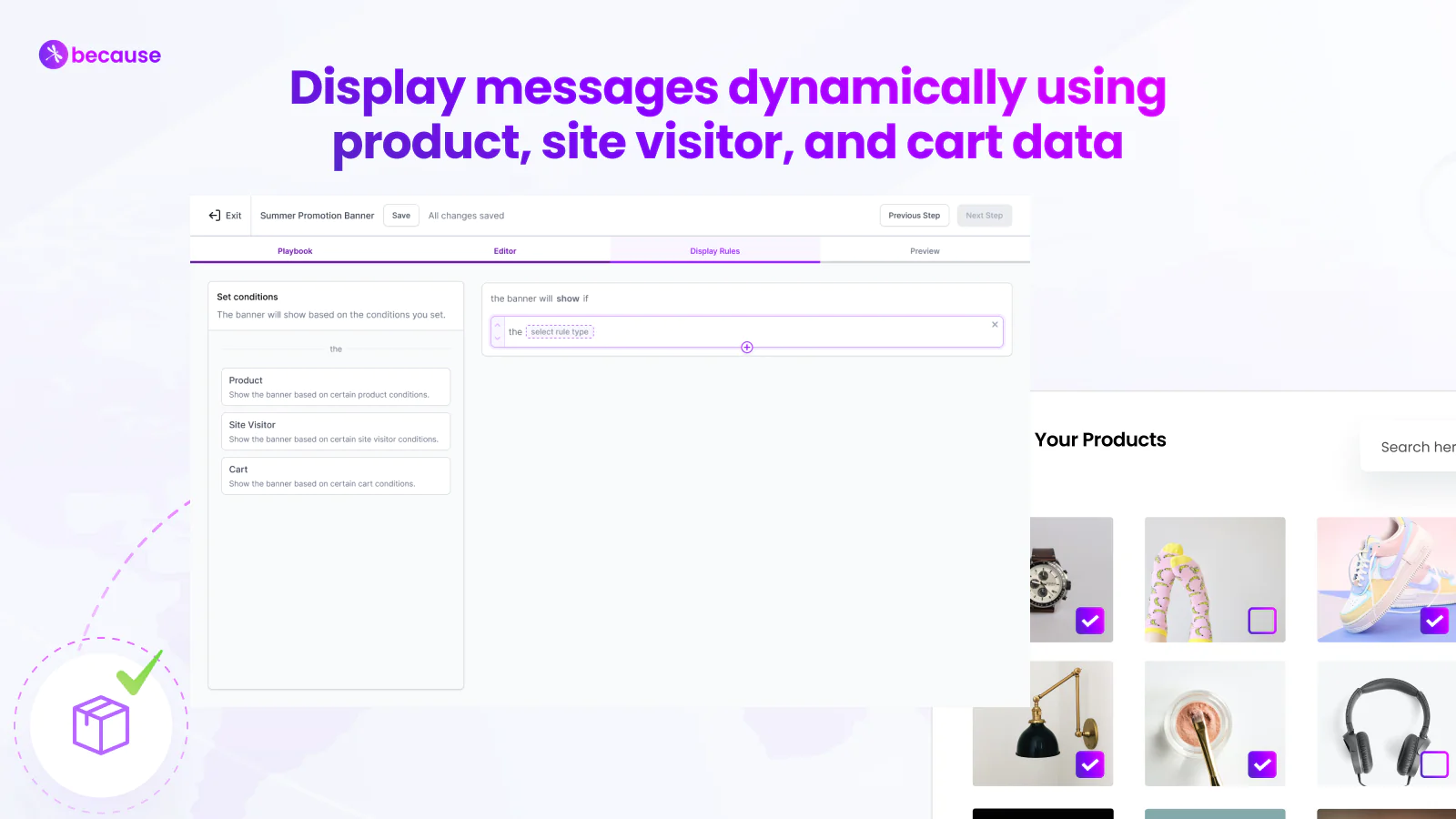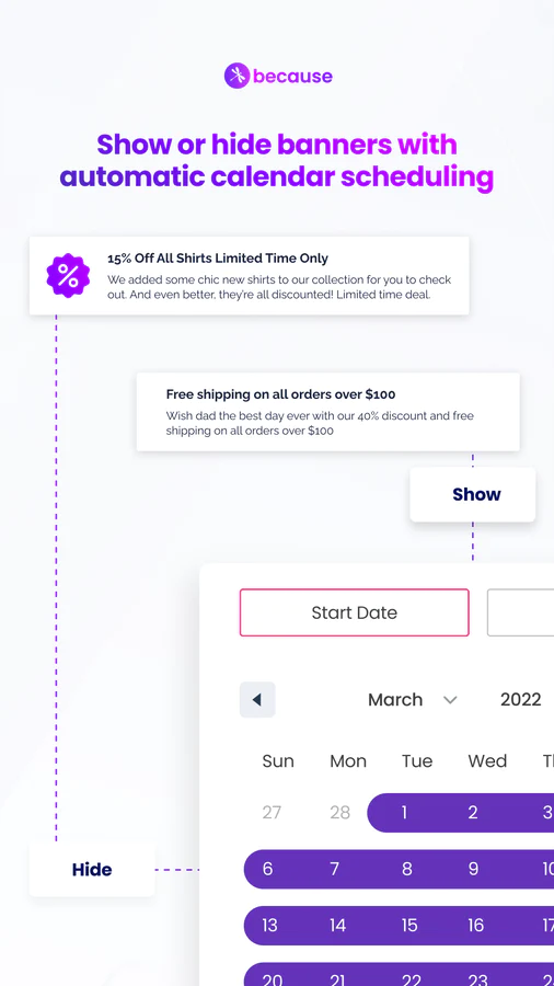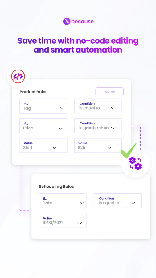 Because has a library of copy and design templates to help you get started. Select a template or make your own, write your message, and set intelligent rules to update one or many product pages at once. 100% No-code and mobile-responsive.