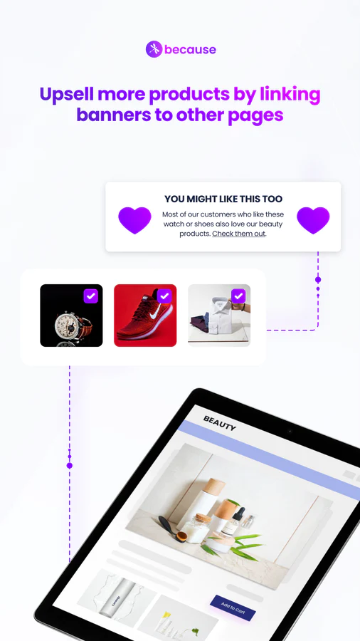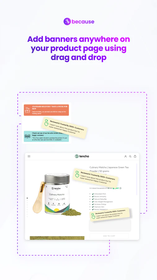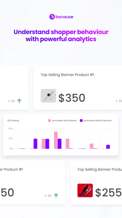 Score 48% More Conversions : Shopify stores get up to 48% more conversions with Because banners and text. Boost add-to-cart rate, convert more shoppers, and grow faster!