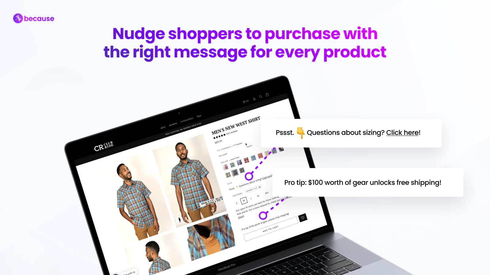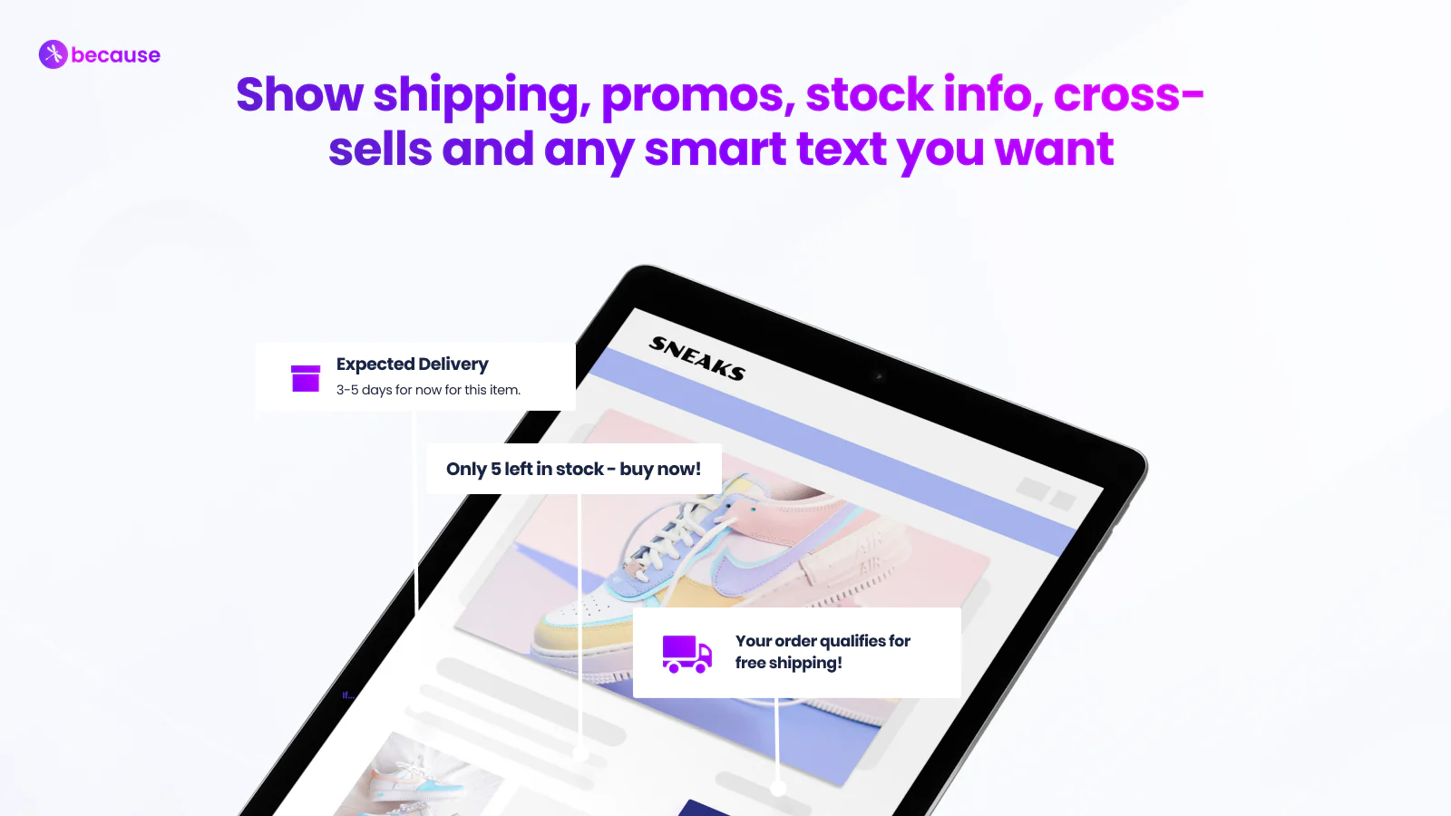 Add unique messages to products with Because product page banners and text elements to influence shoppers to checkout. Increase your add to cart rate, boost conversions and get more sales.