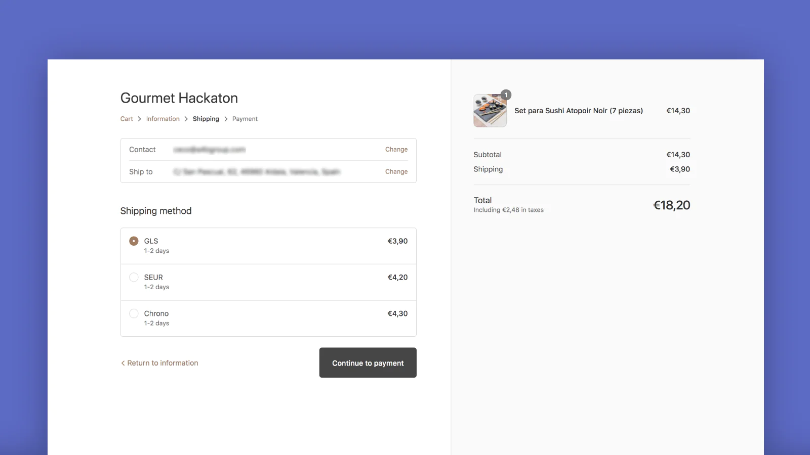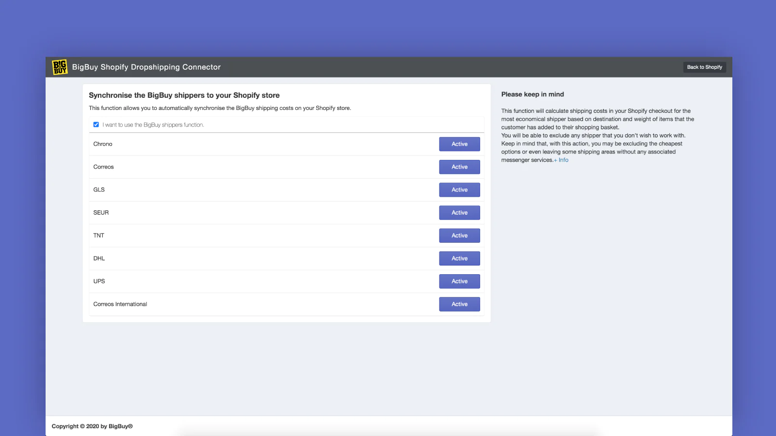 Synchronise your ecommerce with BigBuy's transport companies and you'll automatically get the shipping cost with the main couriers without having to manually configure the shipping cost to each country. The App will automatically provide you with this cost according to the delivery address and the weight of the products in the cart.
