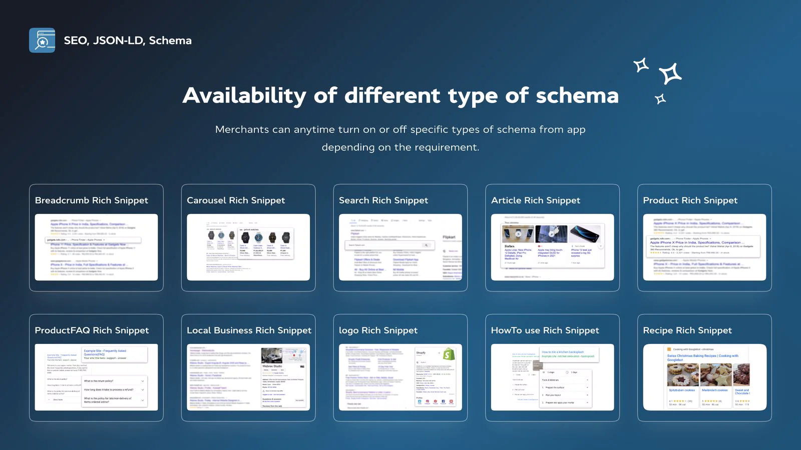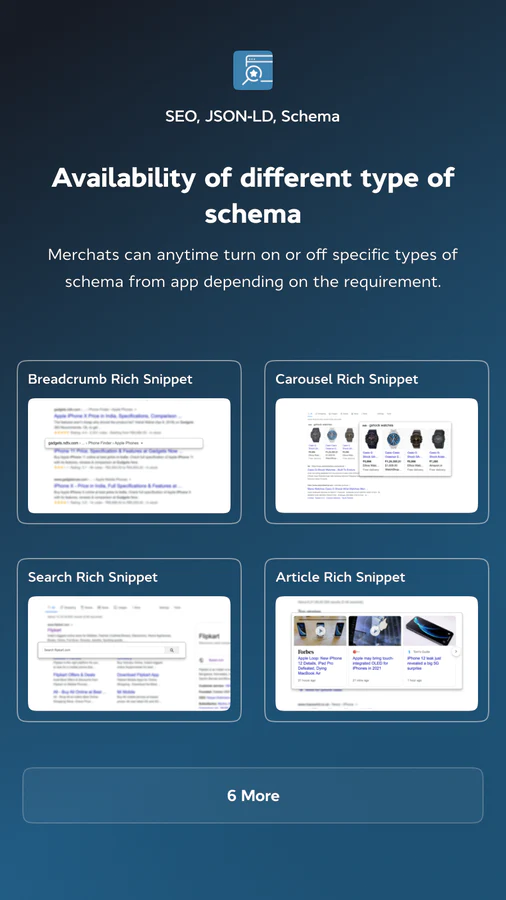 Installation is super simple! Once you add the app to your Shopify store, all you do is click the Enable button that will lead to Shopify admin where you need to mark the toggle on for all required schema and save. That is all