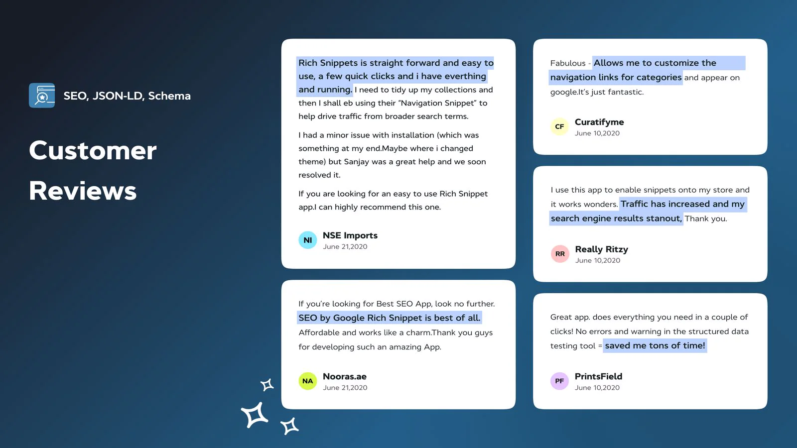 SEO, JSON-LD SCHEMA will install itself automatically when you sign up. We do not modify your template. This means that if you remove this application, we will remove any traces of it. Equally, you won't need to re-install this application every time you update your template.