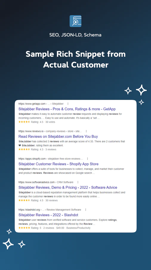 Rich Snippets for SEO is an app that enables Rich Snippets for your store, products, product reviews, blog articles, and social media profiles.