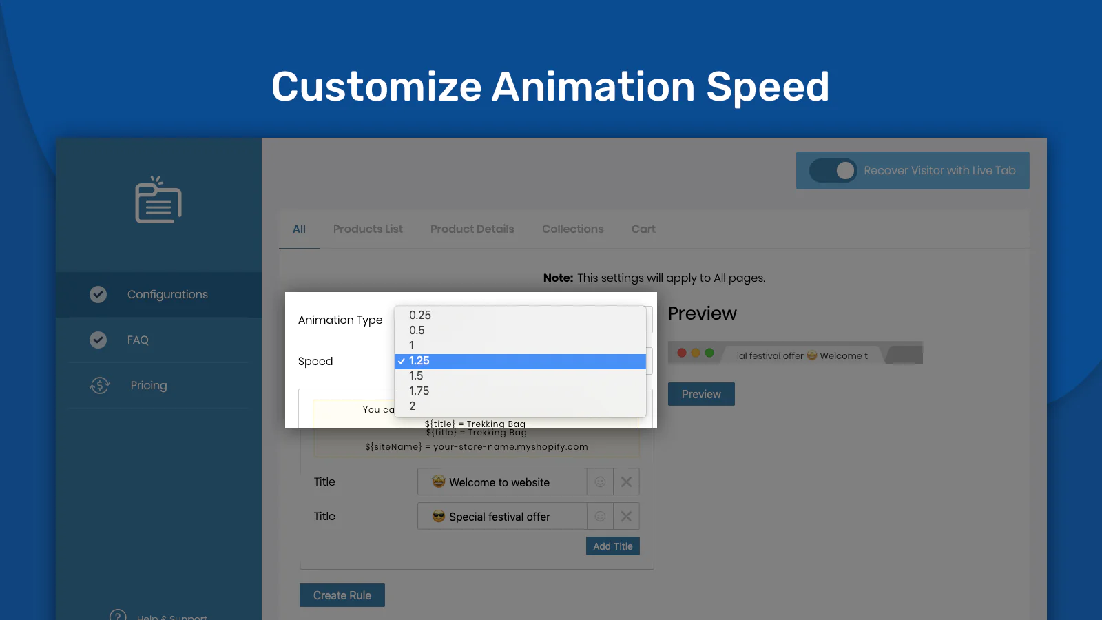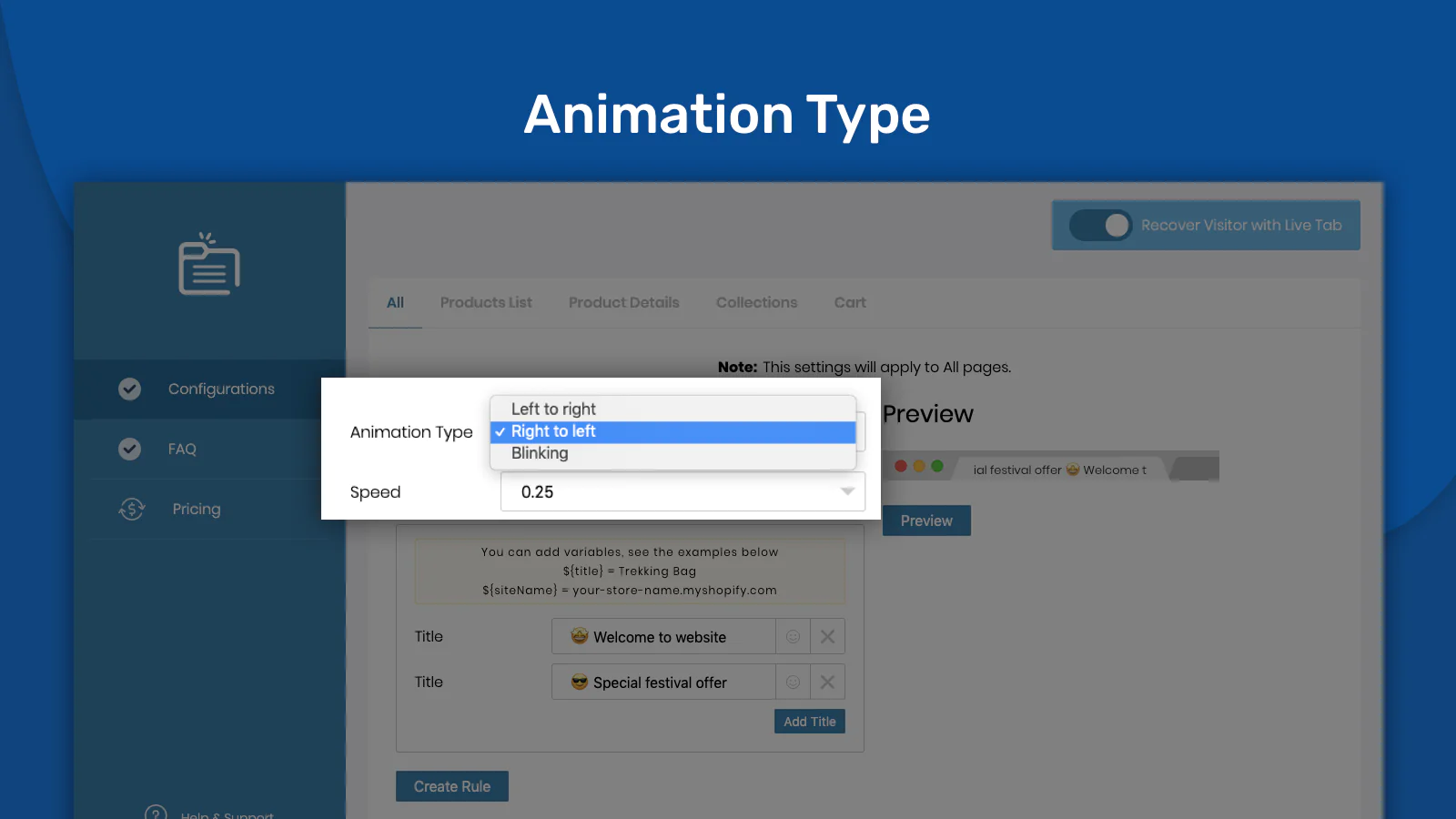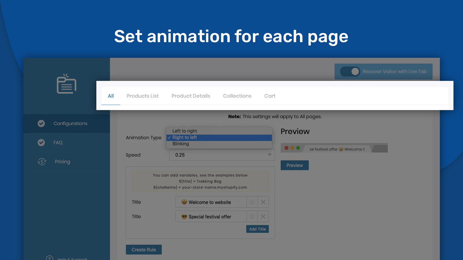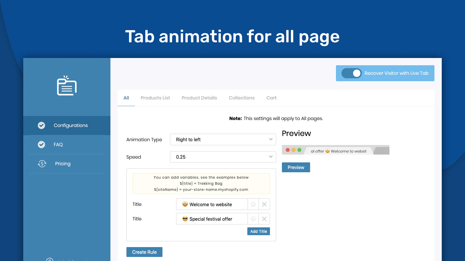 This app helps you create a blinking browser tab to recover sales when they exit. and Work perfectly on all major browsers like Chrome, Safari, Firefox, Opera and more! Recover Visitor with Live Tab provides you many built-in options to make your tab more attractive. You have also the option to customize your tab view. Recover Visitor with Live Tab also Track conversion. This app provides an analysis of the traffic which is getting back.