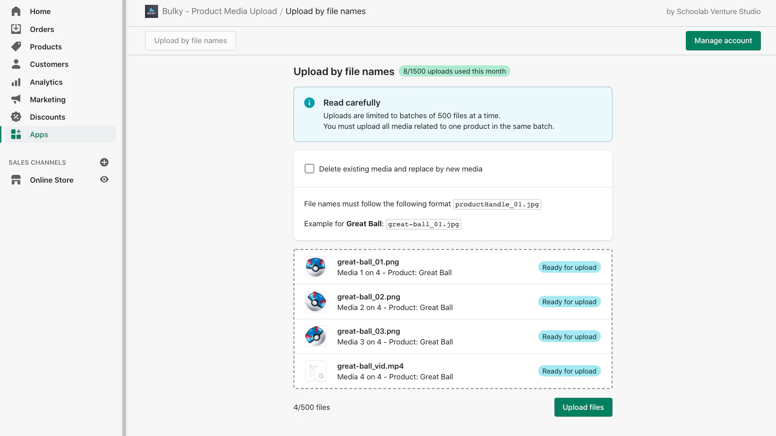 Automatically assign media : Each media is automatically assigned to a product, based on the names of your files or where you dragged and dropped it.