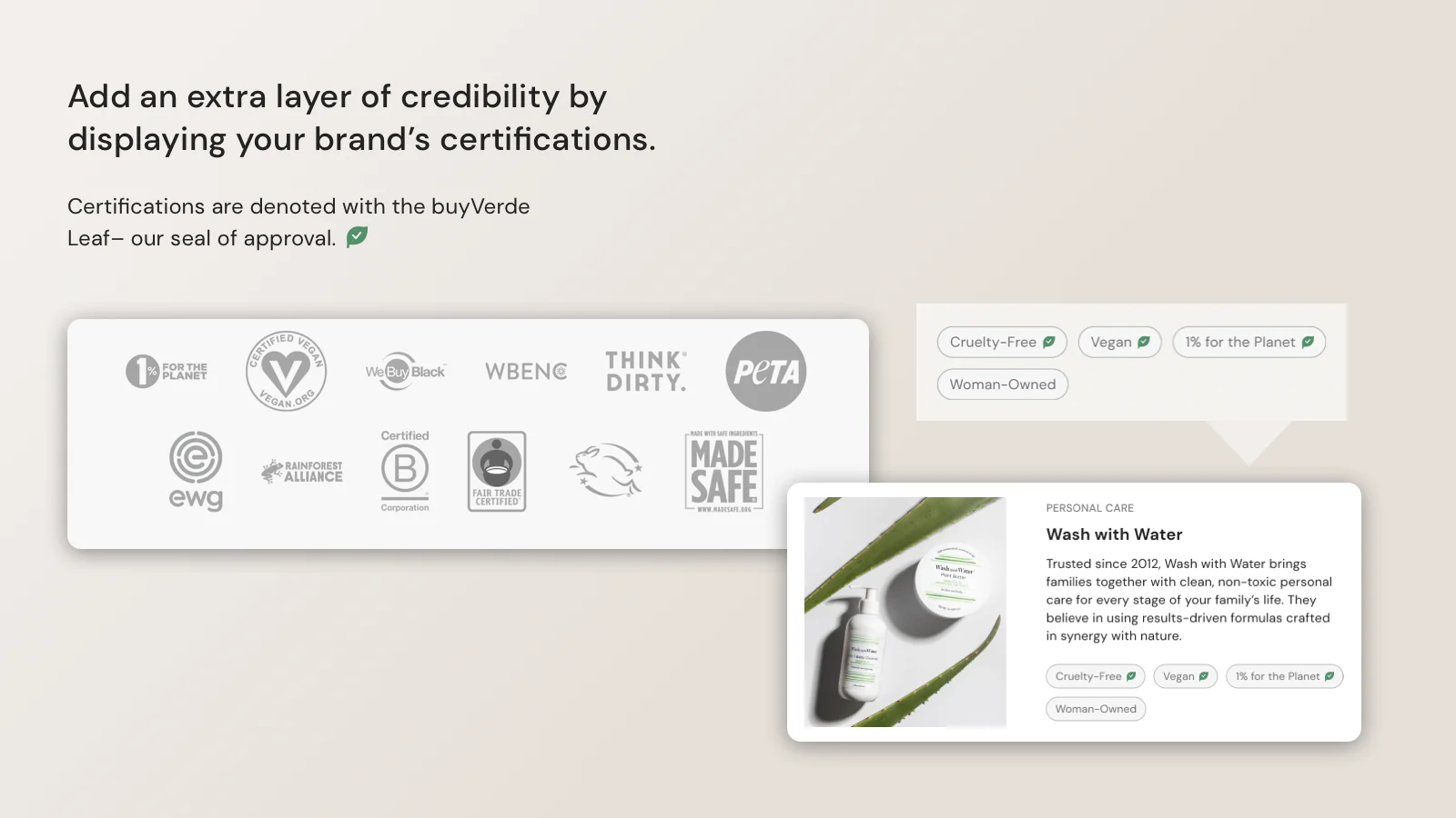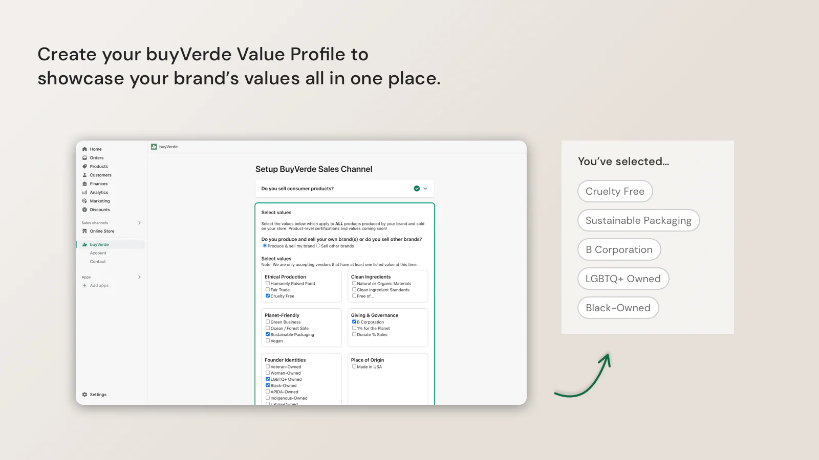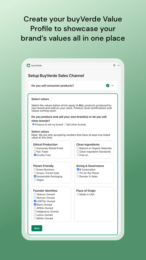 Save brand values in one place : Make it easy for shoppers to see what you stand for. buyVerde collects a complete Value Profile for your brand, including certifications.