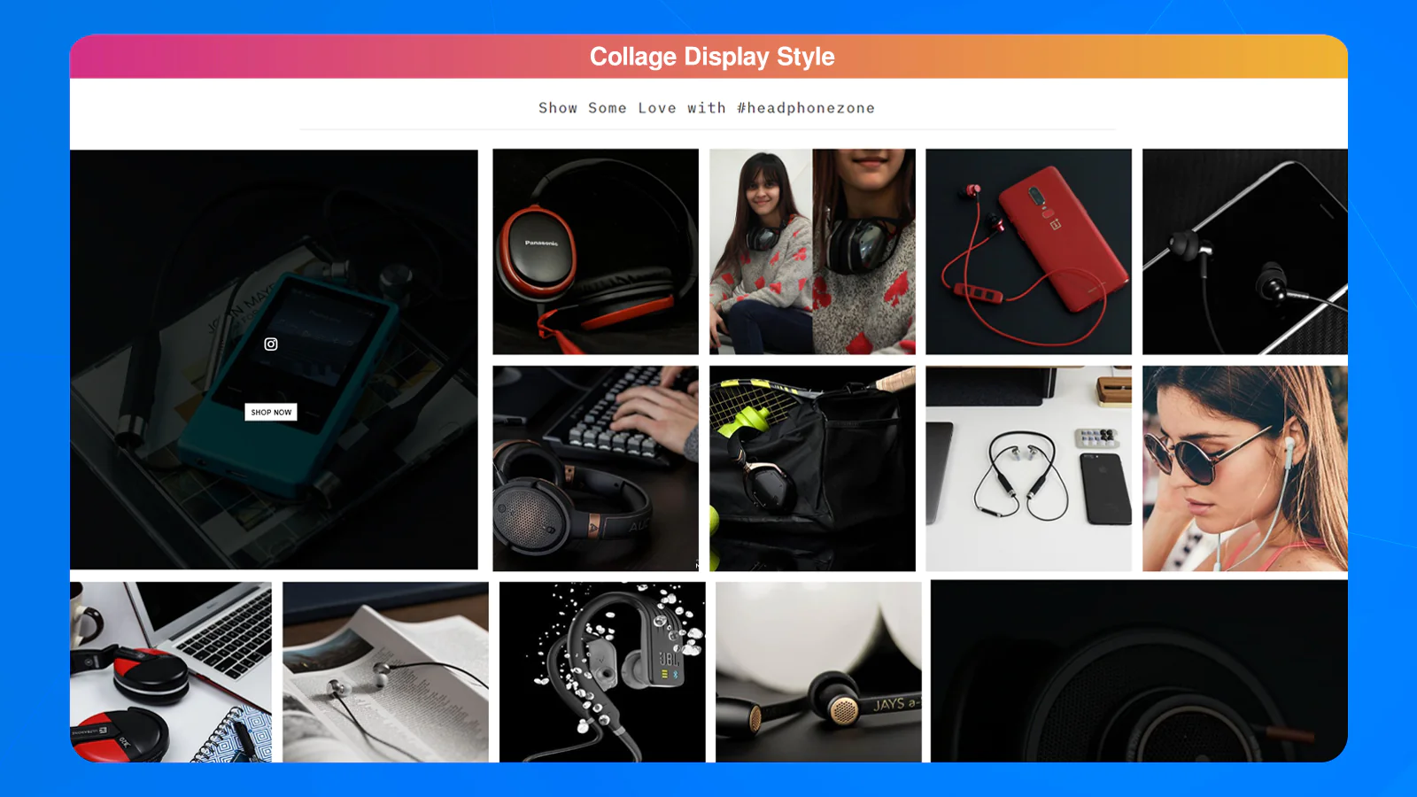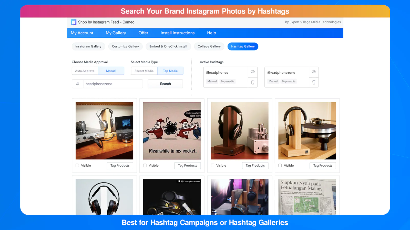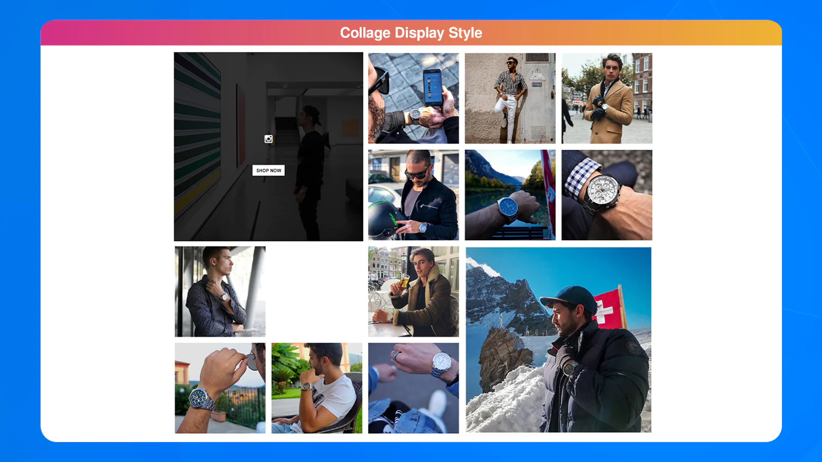 You can search images by using hashtags and tag products on the images or show all those images as a gallery. Best feature to run hashtag campaigns or to show images from your brand hashtags.