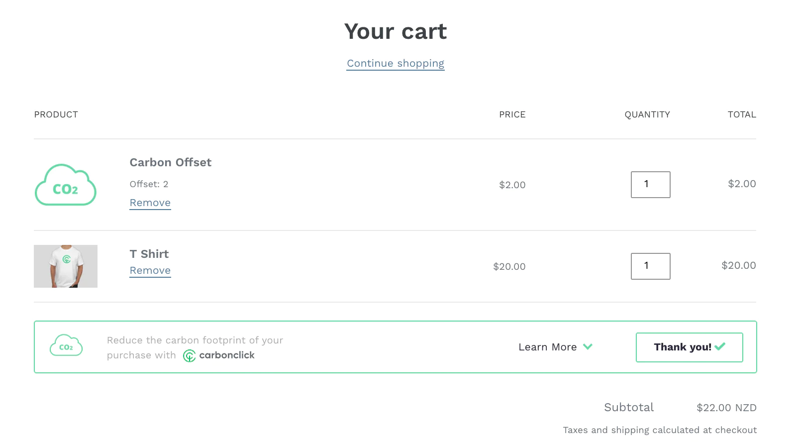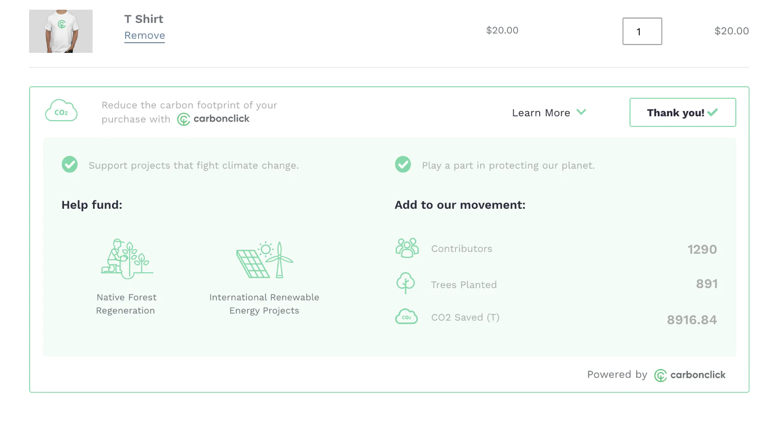 With our Climate Friendly Cart, your customers can fight climate change by offsetting the carbon footprint of their purchases. With just one click, they will experience instantaneous, fully-transparent climate action, and you will experience increased loyalty and higher repurchase rates.