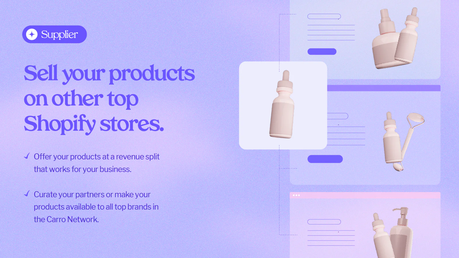 Get started and list your products as a Carro Supplier. You only pay a transaction fee when someone purchases on a partner store. Carro sends the orders right into your Shopify instance like any of your own products. The perfect alternative to affiliate marketing or paid social advertising!