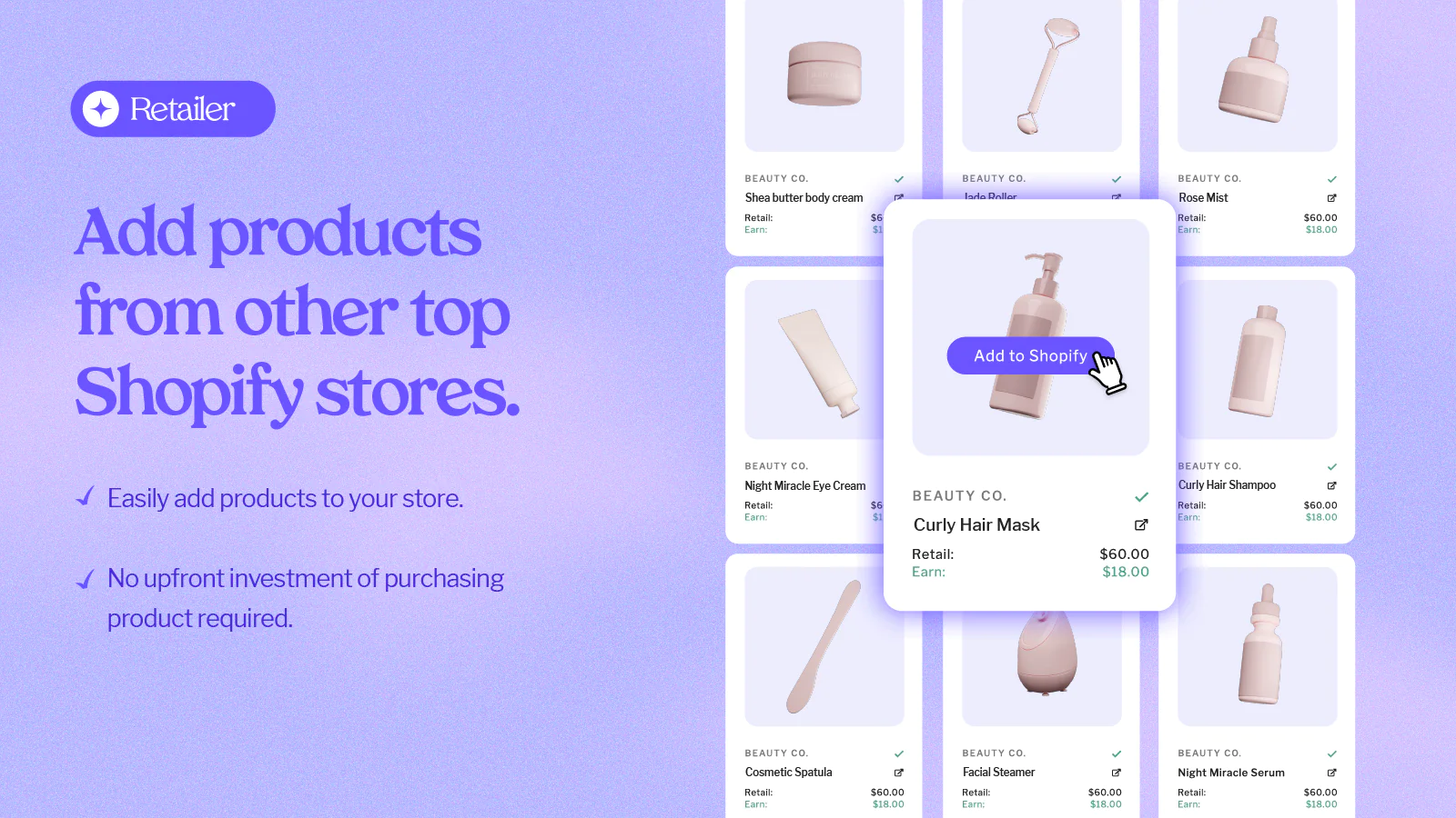 Add new products to your store : Add new products from top brands with the click of a button. Add products to your store without MOQs, inventory, shipping, or sourcing costs