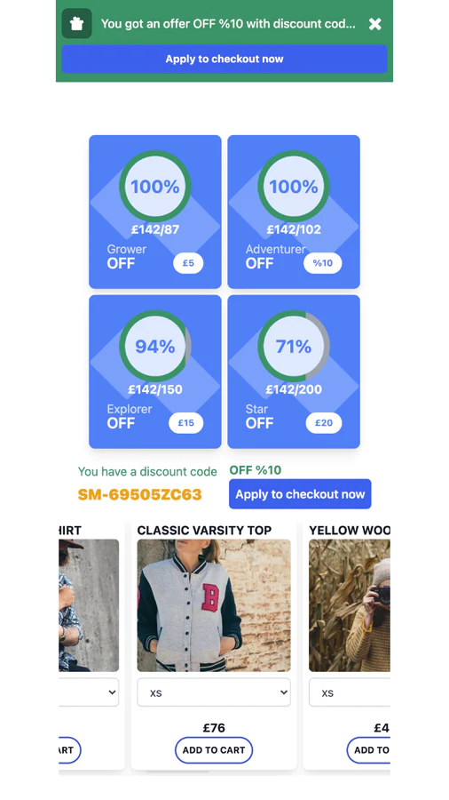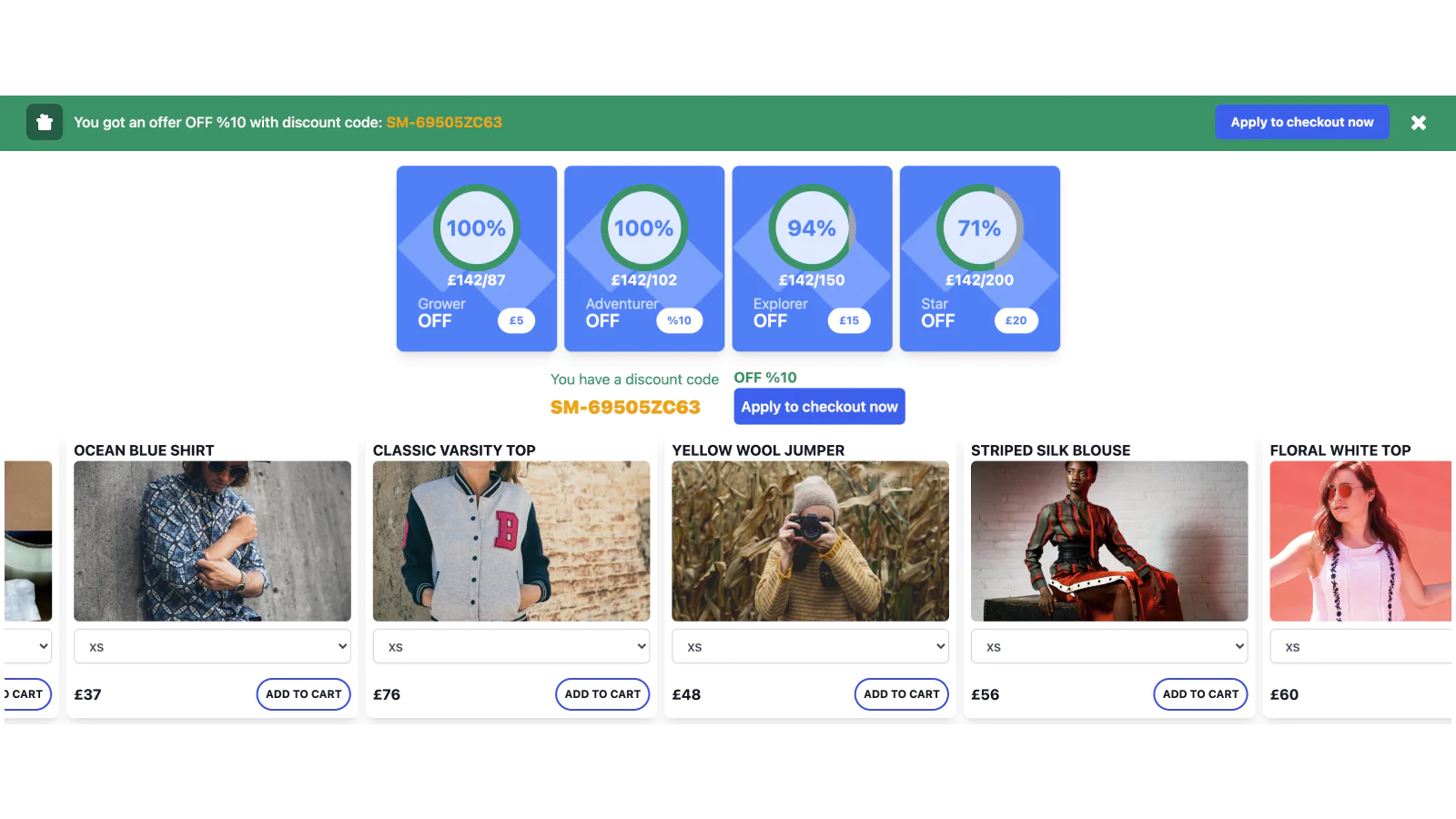 Once integrated, the app will show a nice discount goals widget on your storefront. Your store will start offering the dynamic discount code to different buyers around the world.