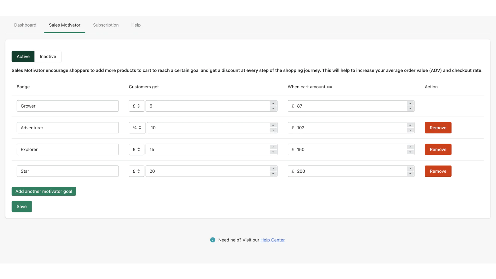 Multiple Discount Goals : Automatically offer different discount code to buyer's cart total based on the pre-defined rules. Customers get X when cart's total at Y.