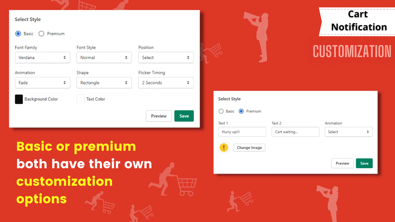 Cart Notification is fully customizable so store owners can adjust the notification to fit the store's look and feel! including: