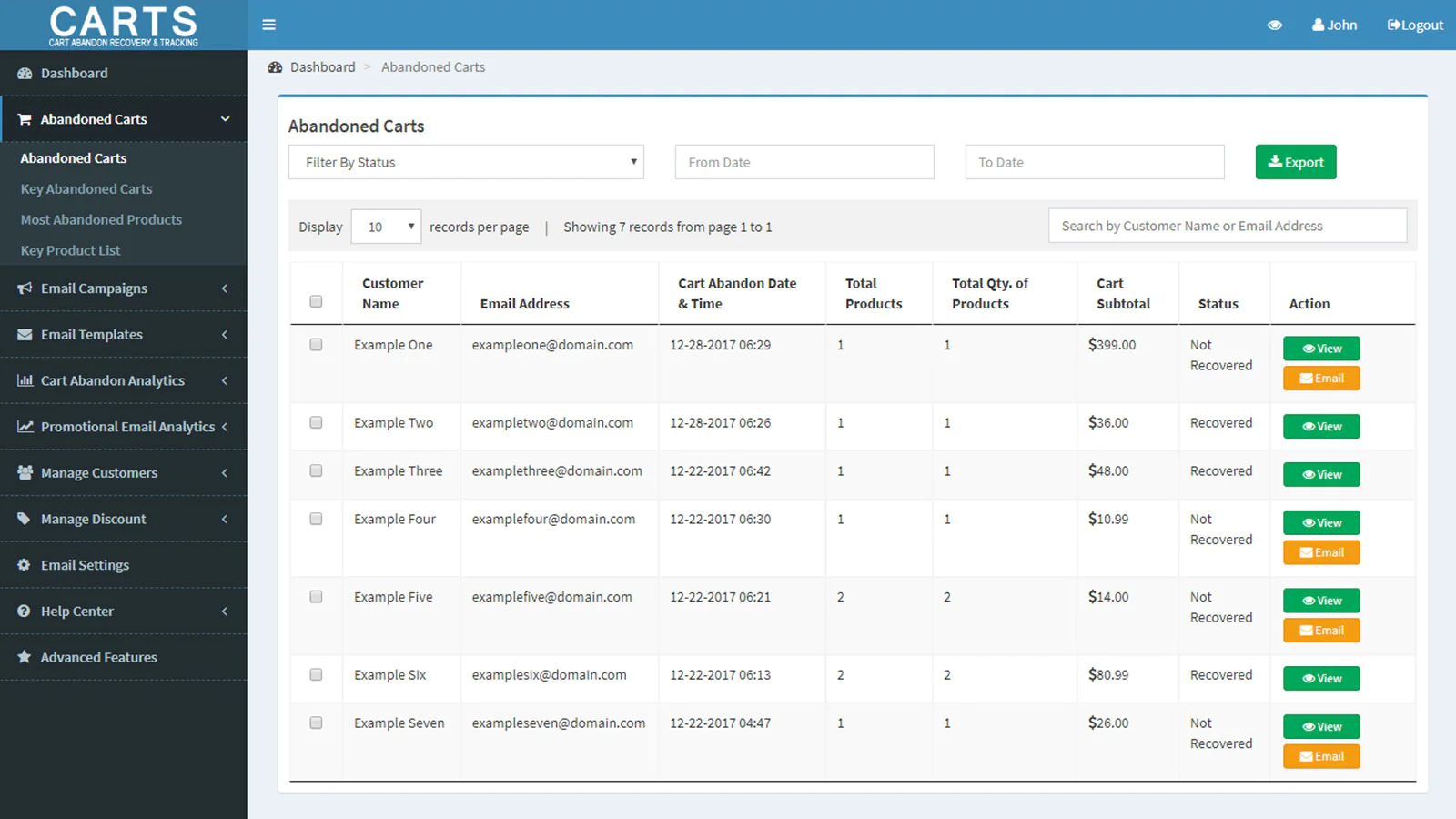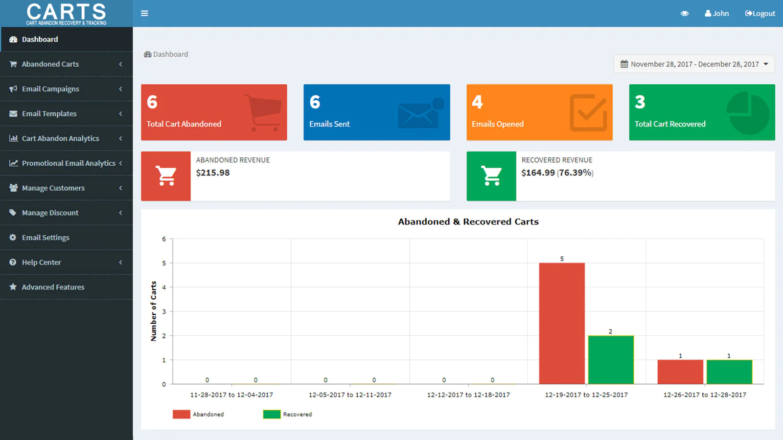Cart Recovery & Tracking Suite application instantly tracks abandoned carts and customer information and provides an interface to view the abandoned cart data. It also has the feature to compare cart abandon data for the selected dates/duration.
