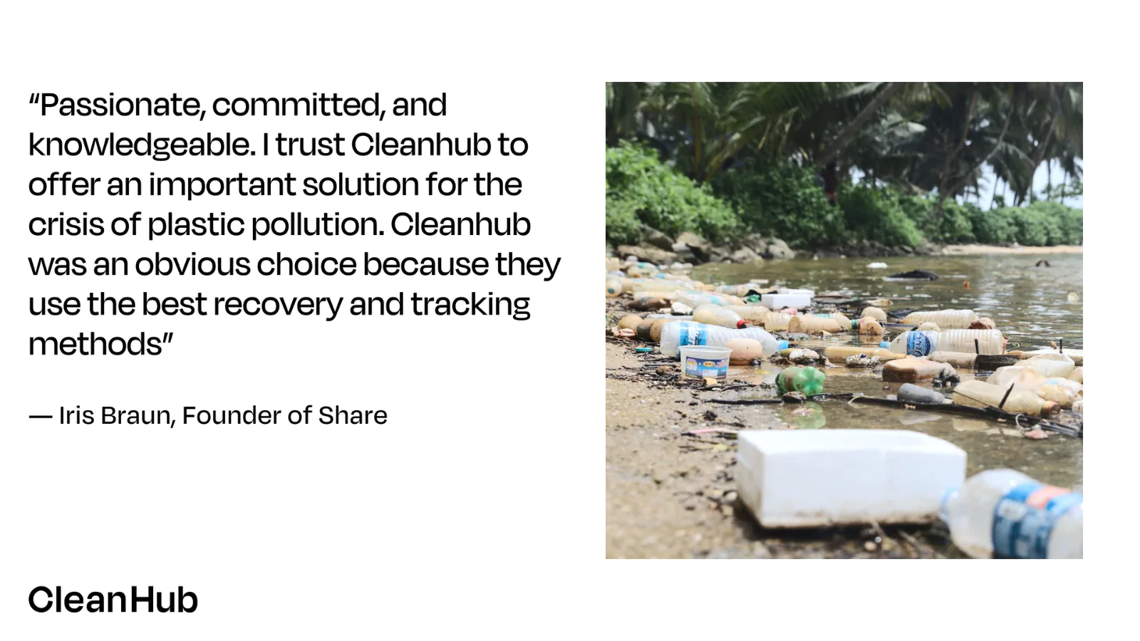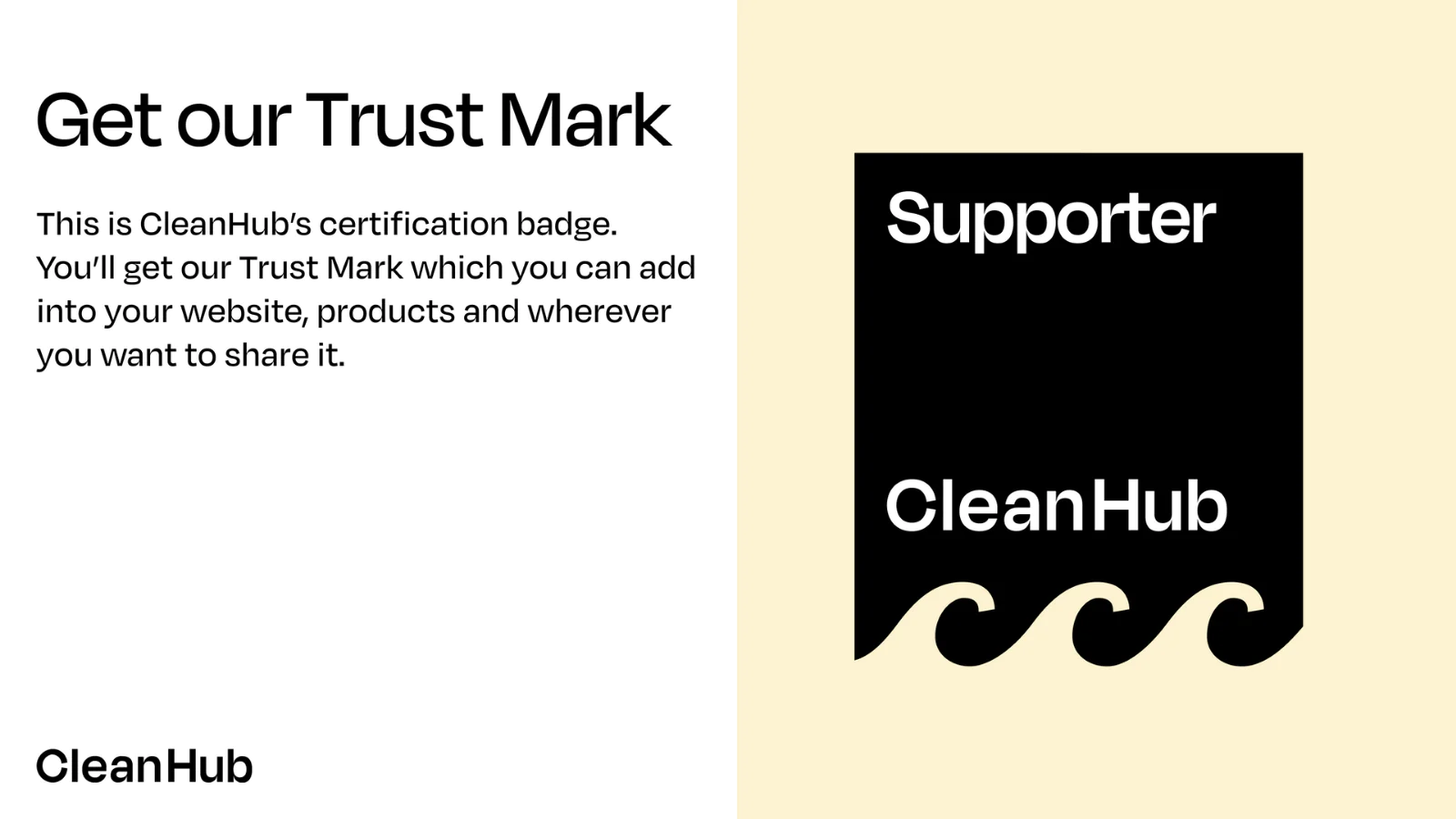 We understand the importance of proving impact, so we’ve built track & trace technology to provide evidence of how much plastic is collected, and where it ends up after we take care of it. You'll receive a CleanHub trust mark which you can share on your website and packaging.