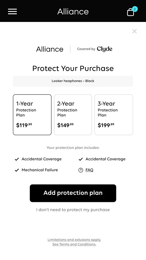 Eligibility is dependent on a number of factors, such as if a product has electrical or mechanical components, how it is used, and how claims would be resolved. In order to be eligible, products must have a minimum 14 day return policy and a 90-day limited warranty. Clyde protection plans are available to US consumers only.