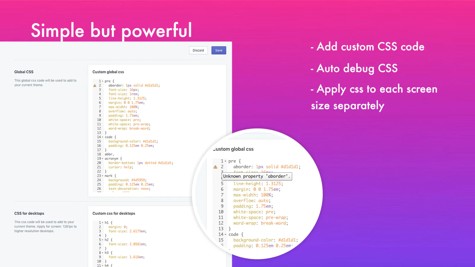 Custom CSS : Quickly and easily add custom CSS for varied screen sizes (Desktop, laptop, mobile ...) to your store.