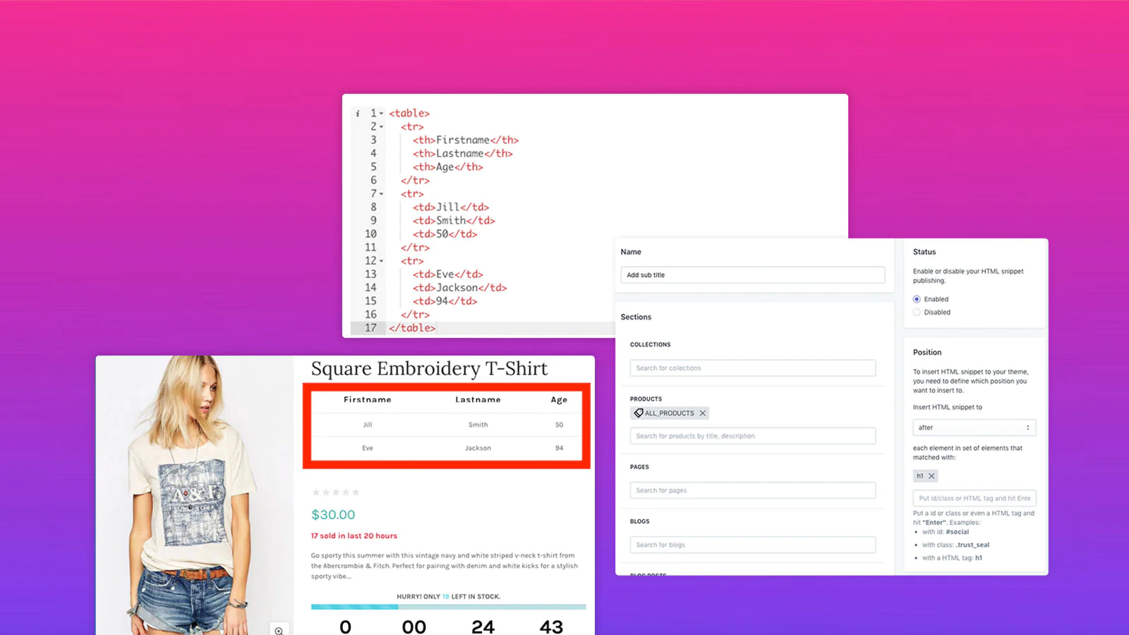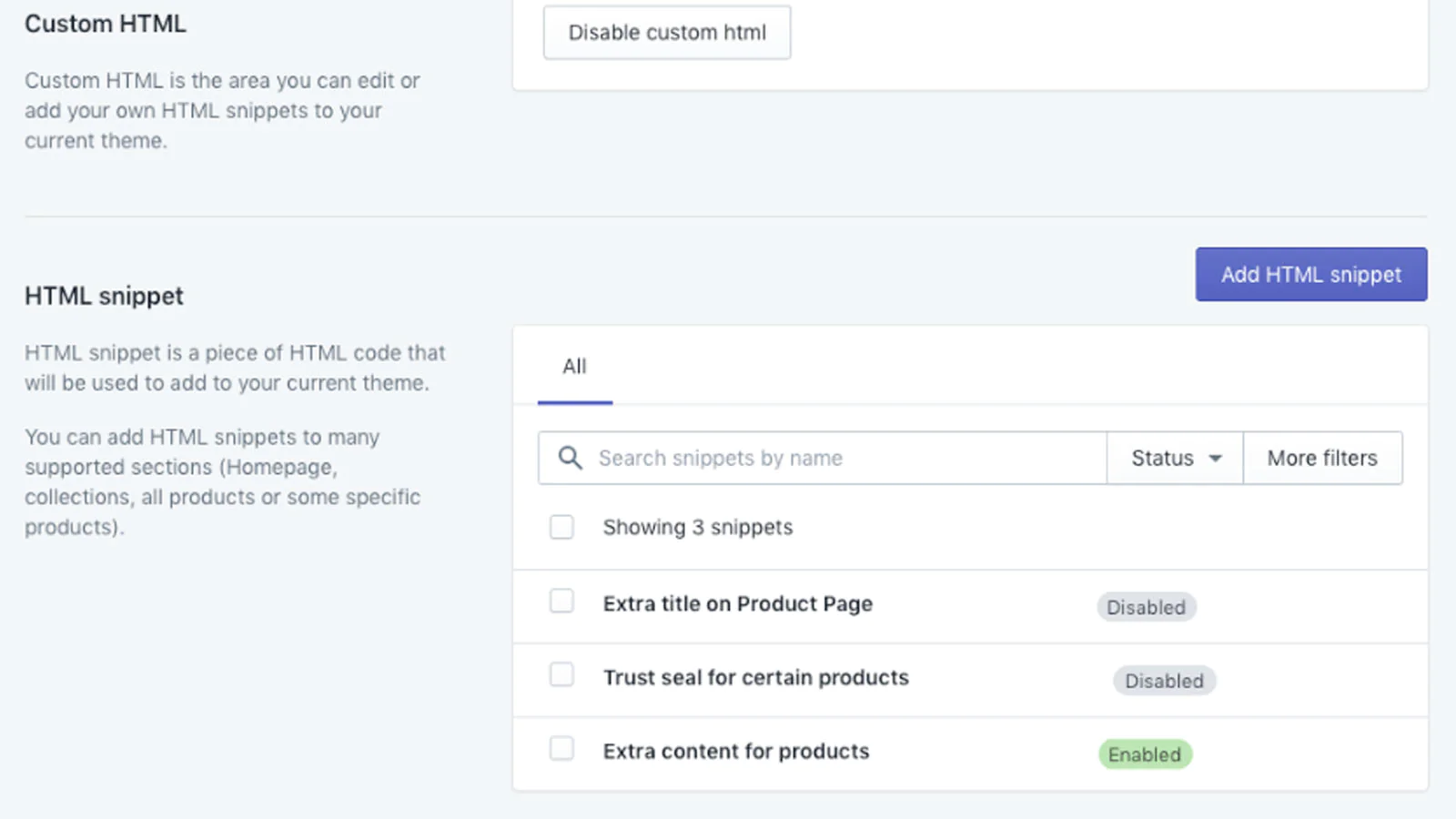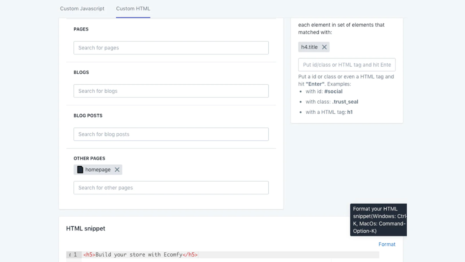 Custom HTML : Add your custom HTML snippets to any pages, collections, blog, all products or event some specific products.