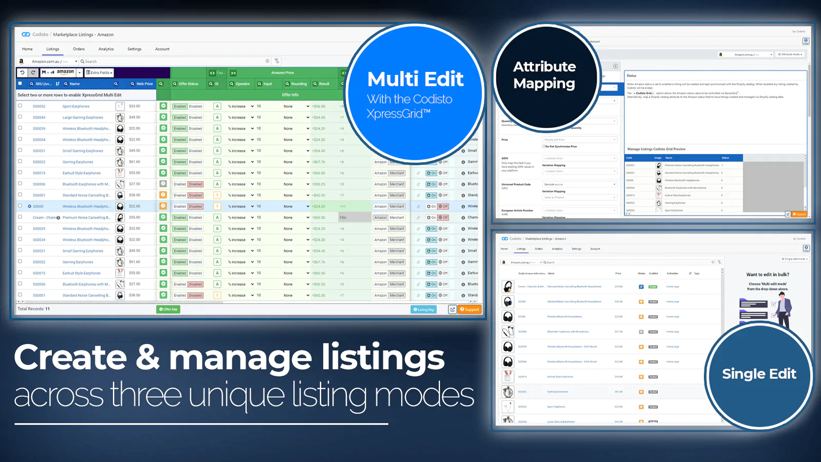 Choose from three distinct listing modes – single-listing, multi-listing or attribute mapping – with a suite of powerful automation features making it easier than ever before to create, sync & manage sales channel listings across Google, Amazon & eBay all in the one place.
