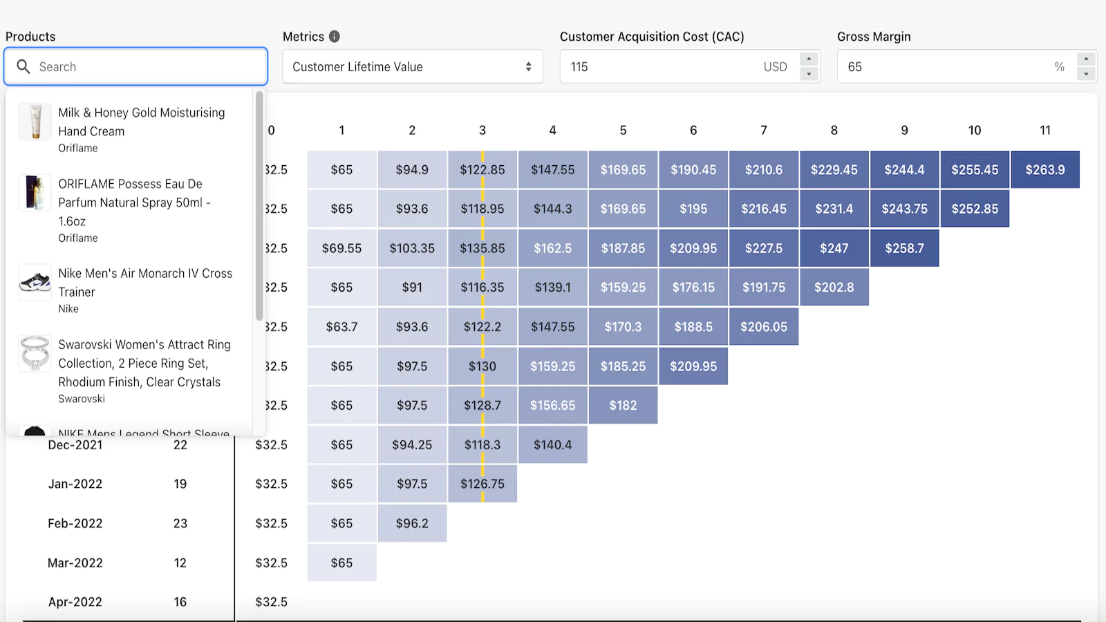 • Customer Life Time Value (in terms of gross profit and customer acquisition cost)