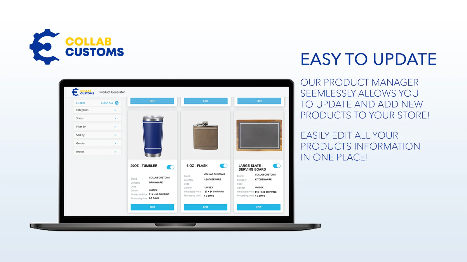 Collab Customs was founded on the idea we could supply unique and niche products to customers that, would allow you to expand away from just selling custom clothing. You can easily test out new products and designs without having to worry about inventory or excessive overhead costs.