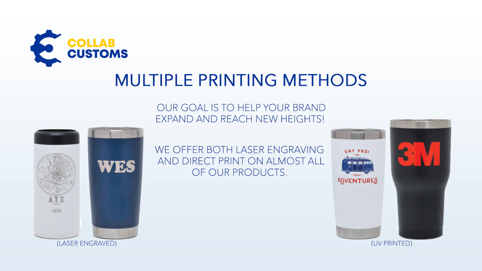While some companies outsource their printing to various merchants, Collab Customs does all the printing/engraving in-house! We don’t outsource to other merchants. This means when you work with us, you're getting our guarantee that the products shipped meet our expectations. Not a random merchant that just wants to get products out the door.