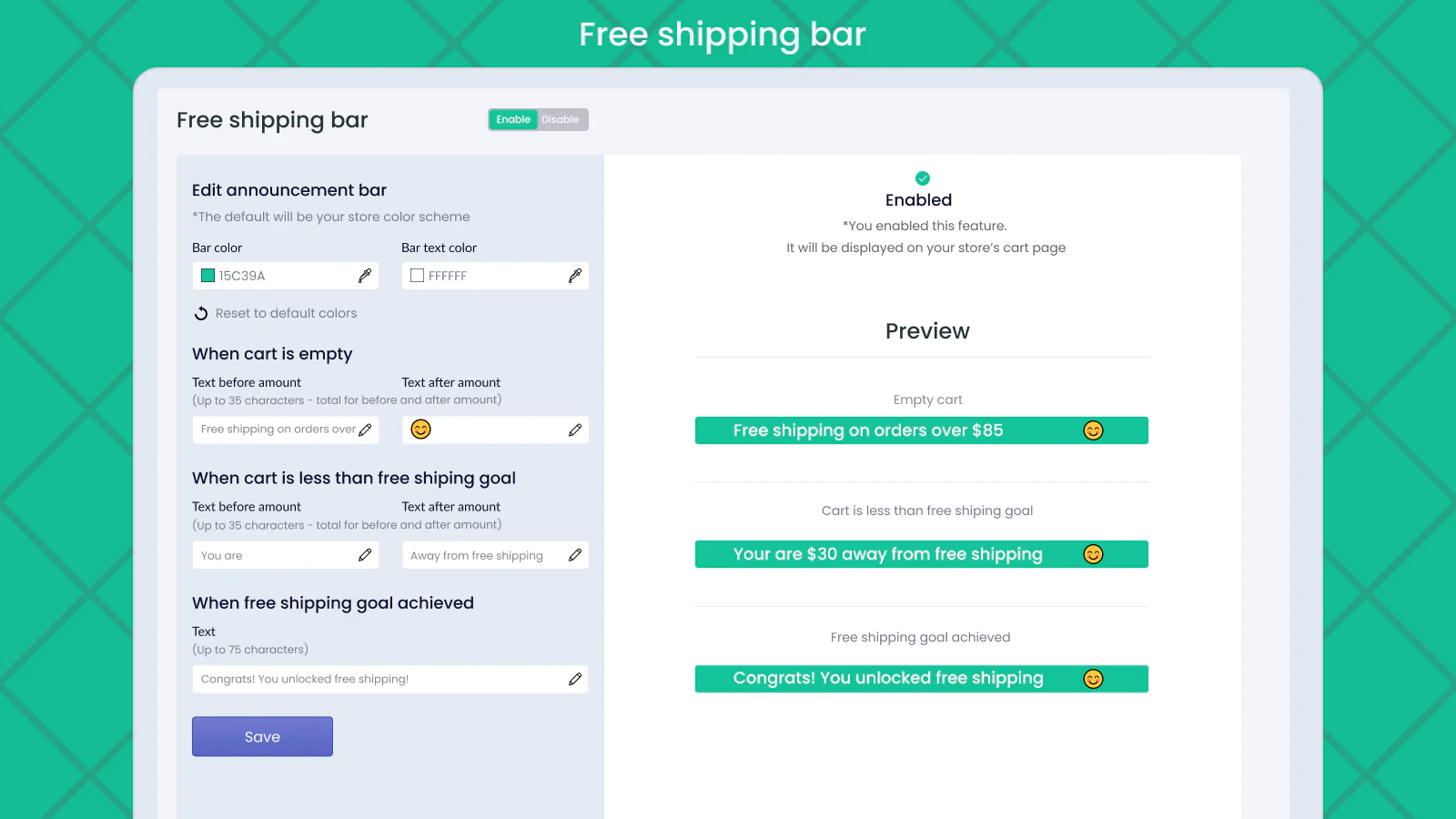 The first smart customizable & responsive cart goal based upsell progress bar that directly correlates with your free shipping offer. Upsell in cart with a smooth and intelligent incentive.
