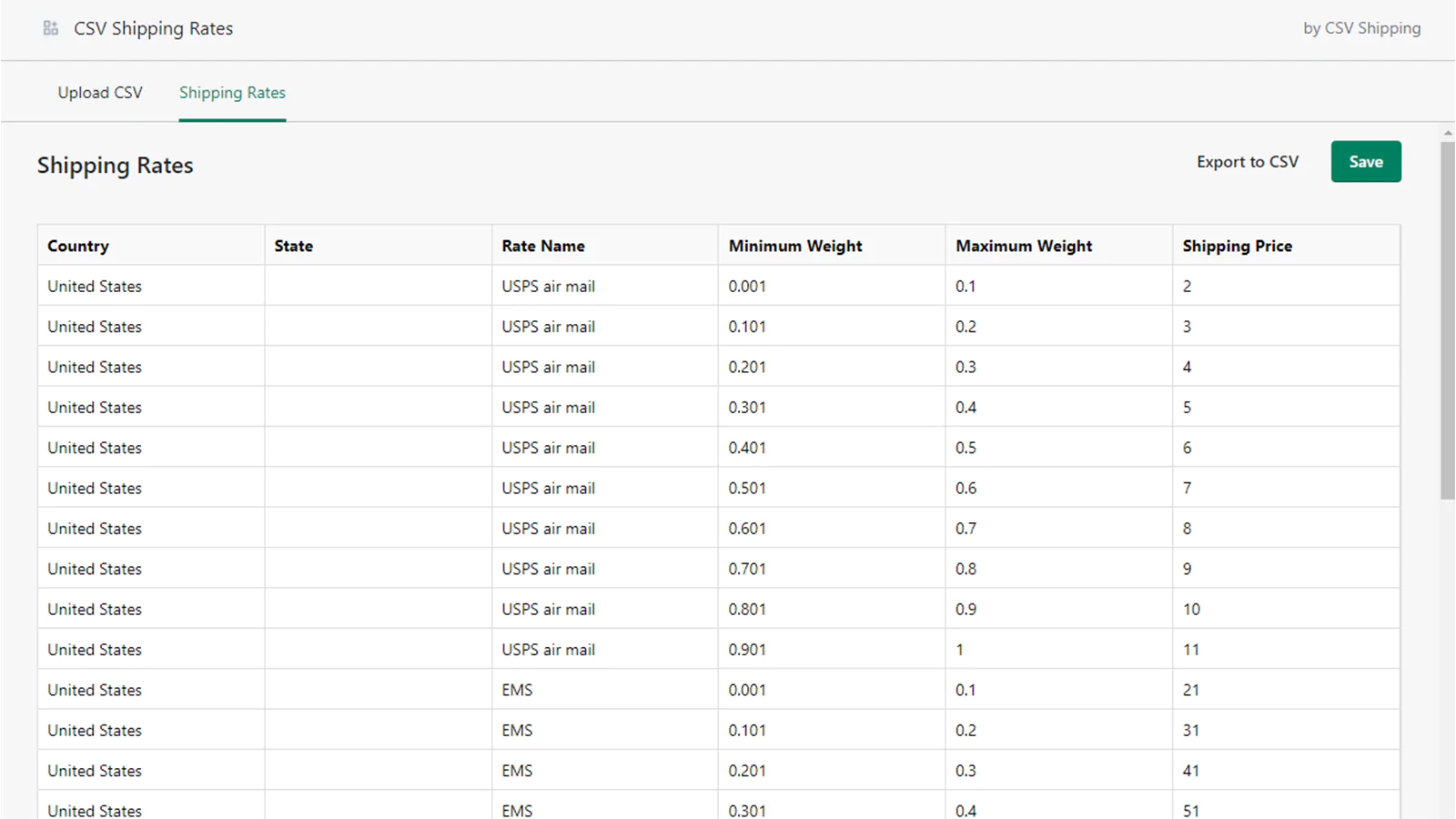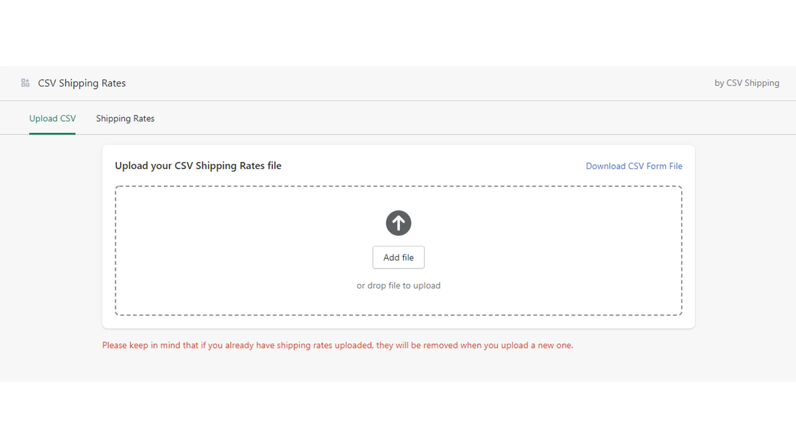 Adding a new shipping method or changing an existing shipping rates is easy. You can edit an existing shipping rates directly or by uploading a CSV file.