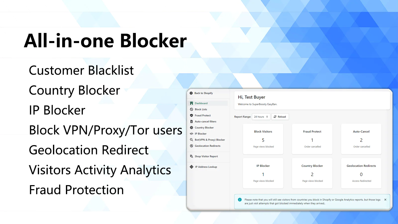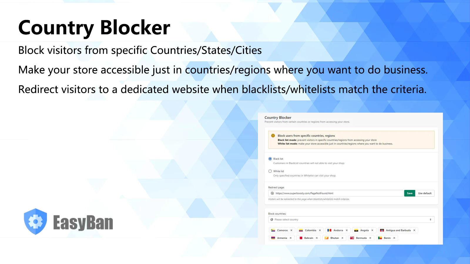 Black list mode: Block visitors from specific countries, states, or cities so you don't get unwanted orders on your Shopify Store. Whitelist mode: If you only want to sell in some specific region, you can add them to the whitelist, and buyers outside these regions will not be able to visit your store. Prevented visitors will be redirected to another website.