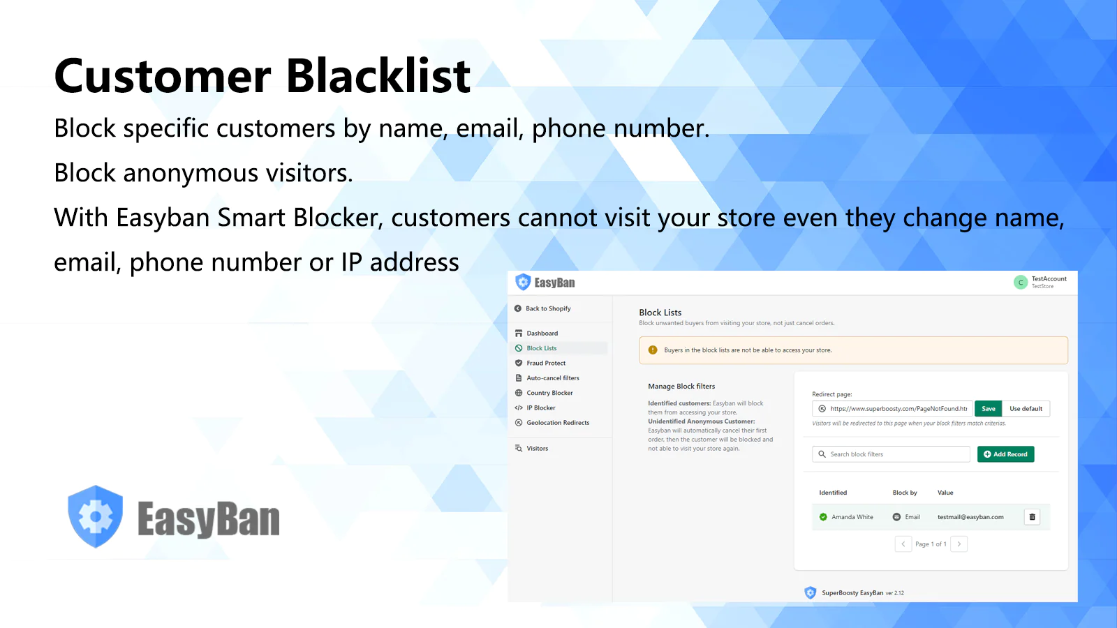Prevent unwanted visitor visit : Prevent specific customers from accessing your store by adding them to block Lists. Even anonymous visitors also can be stopped.