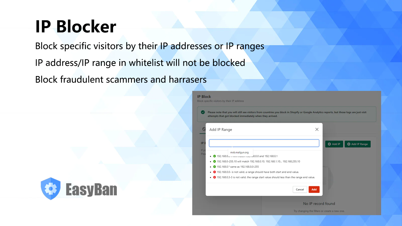 Block unwanted visitors, automatically cancel High-risk orders, block visitors from specified countries/regions, and block visitors by their IP addresses or IP ranges.