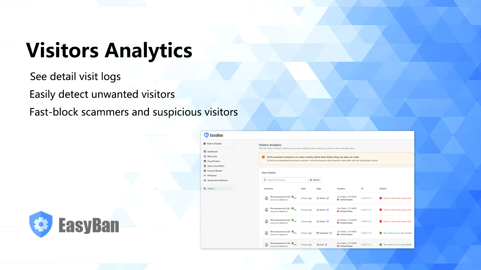 Record all visitors' recent activity logs, including IP address, country, visits page, visit date, etc. You can quickly find undesirable visitors, manually mark them as identified buyers, and add them to the block list to prevent them from revisiting your store.