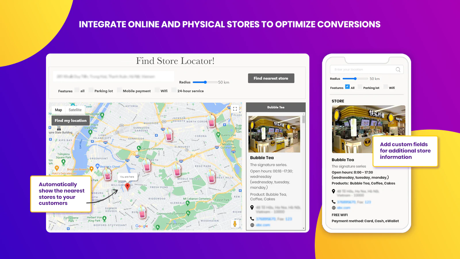 Make Stores Searchable : Let customers search your stores based on targeted criteria like store name or location. Show any field on map or menu block as you wish.